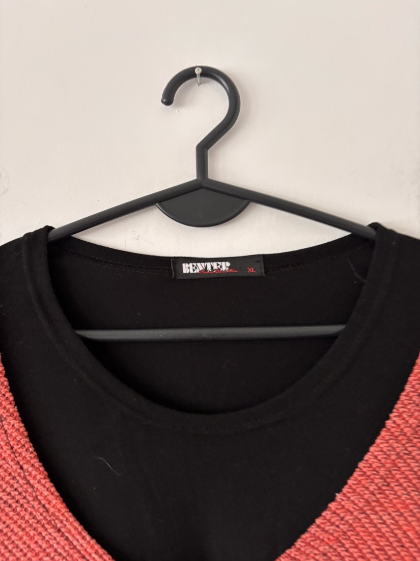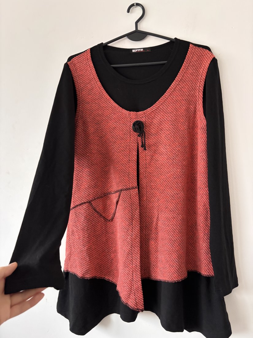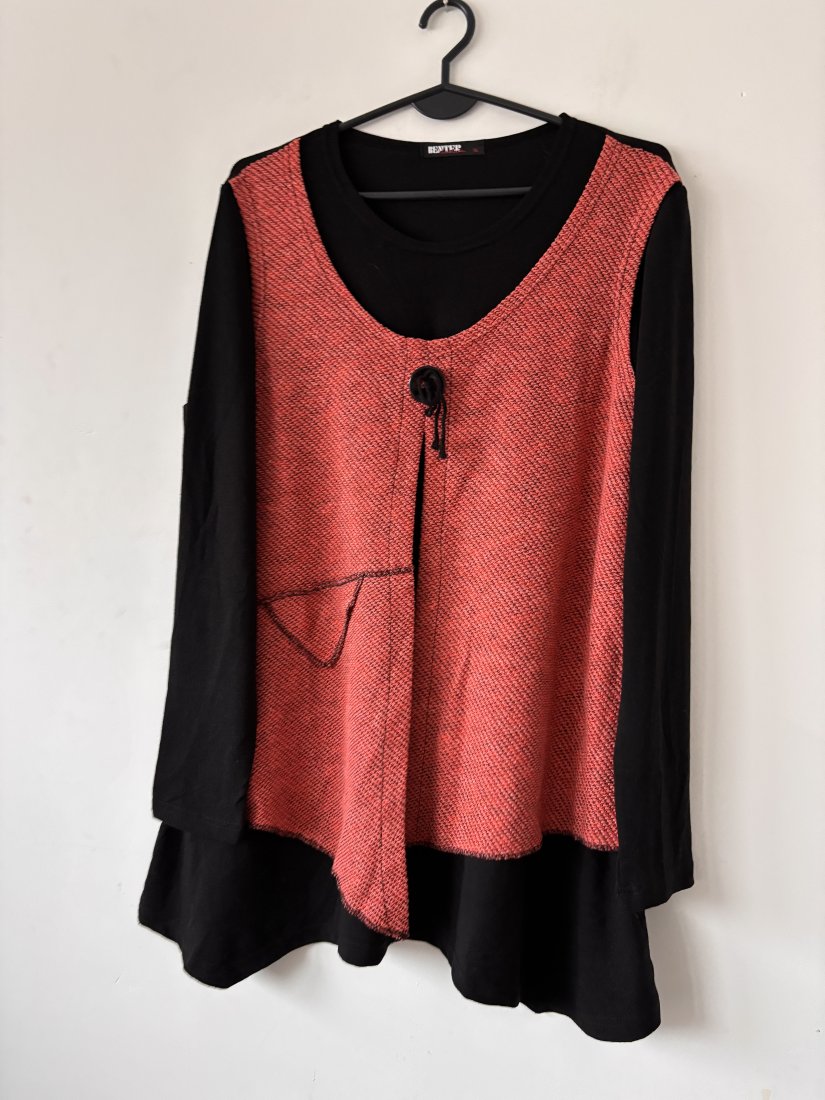 Asymetryczna tuniko-bluza marki Bentter w rozmiarze XL. Model łączy czarną, miękką dzianinę z czerwonym, dekoracyjnym panelem z przodu. Luźny, wygodny fason oversize, idealny na co dzień. Materiał bardzo przyjemny i elastyczny — 92% wiskoza, 8% elastan. Stan bardzo dobry.