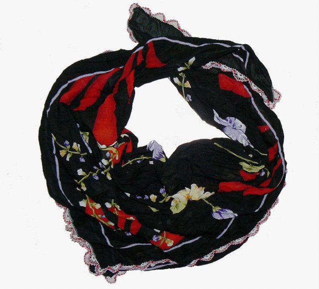 Duża chusta z dość cienkiej, miękko układającej się tkaniny. Kwiatowy motyw na czarnym tle. Brzegi wykończone haftem.
