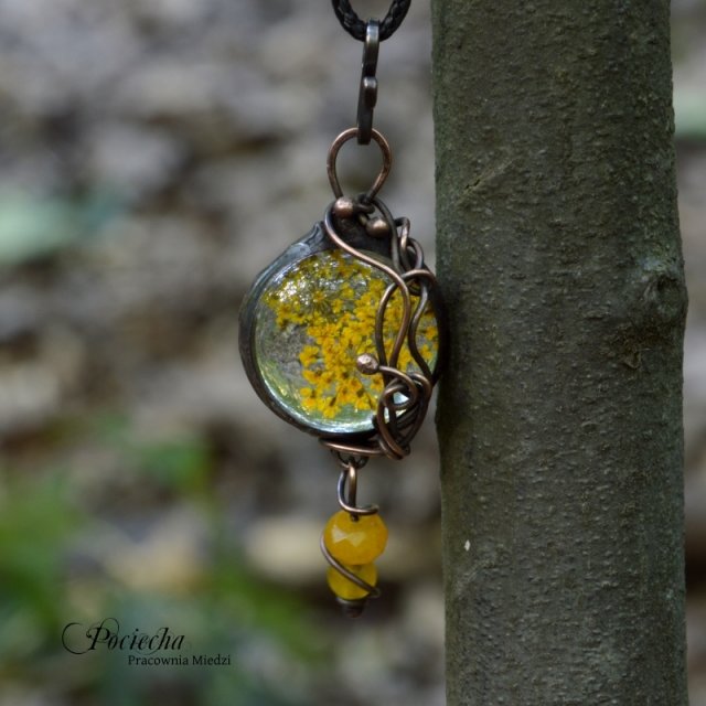 Wisior stanowi połączenie miedzi jubilerskiej ekologicznej cyny ( bez ołowiu ! ) ze szkłem w którego wnętrzu zamknęłam piękny suszony kwiat.