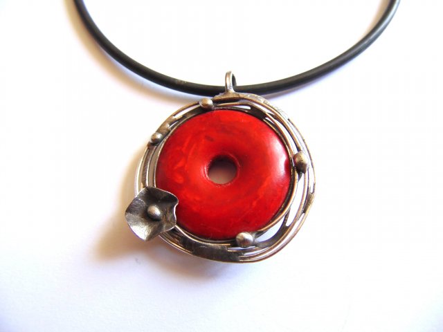Wisiorek wykonany z miedzi, cyny i turkmenitu. Zawieszony na czarnej lince kauczukowej o długości ok. 45 cm. Wymiary ok. 4 na 4 cm.
