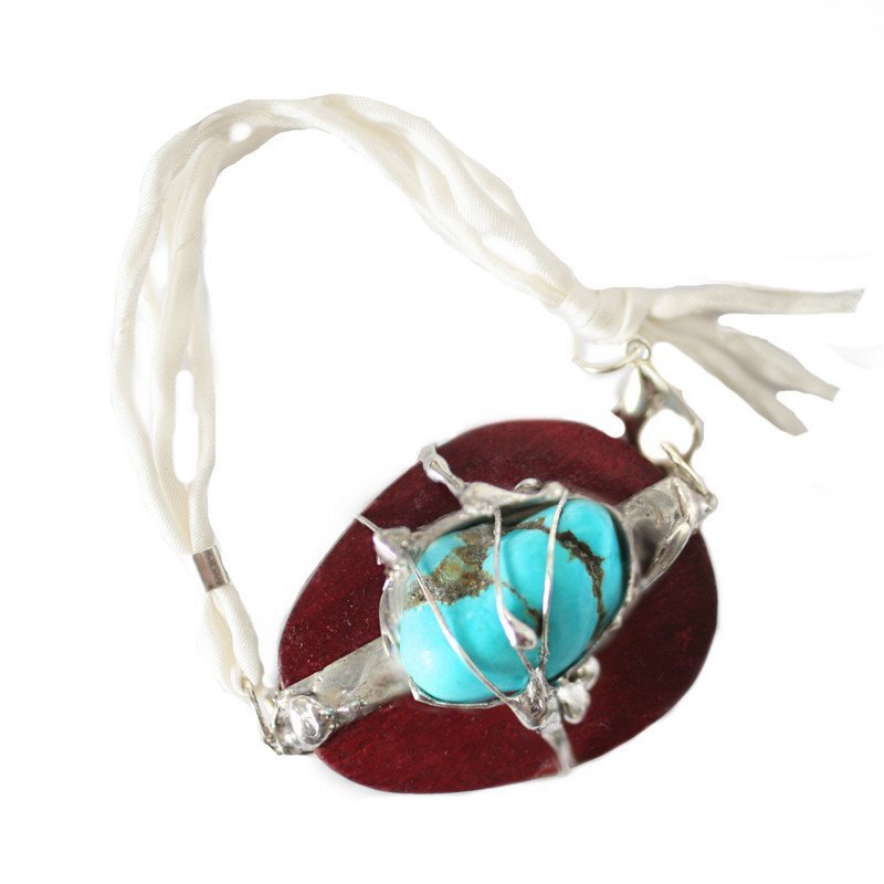 Turkus - bryłka około 26 x 20 x 10 mm i drewno (46 x 37 mm w najszerszym punkcie; kolor bordowy), oprawione ręcznie w ocynowaną miedź