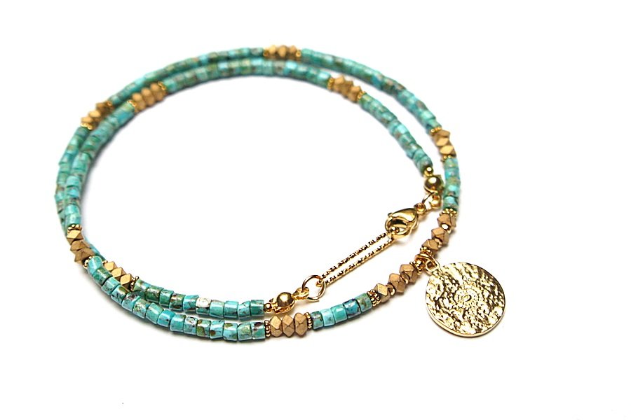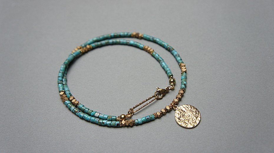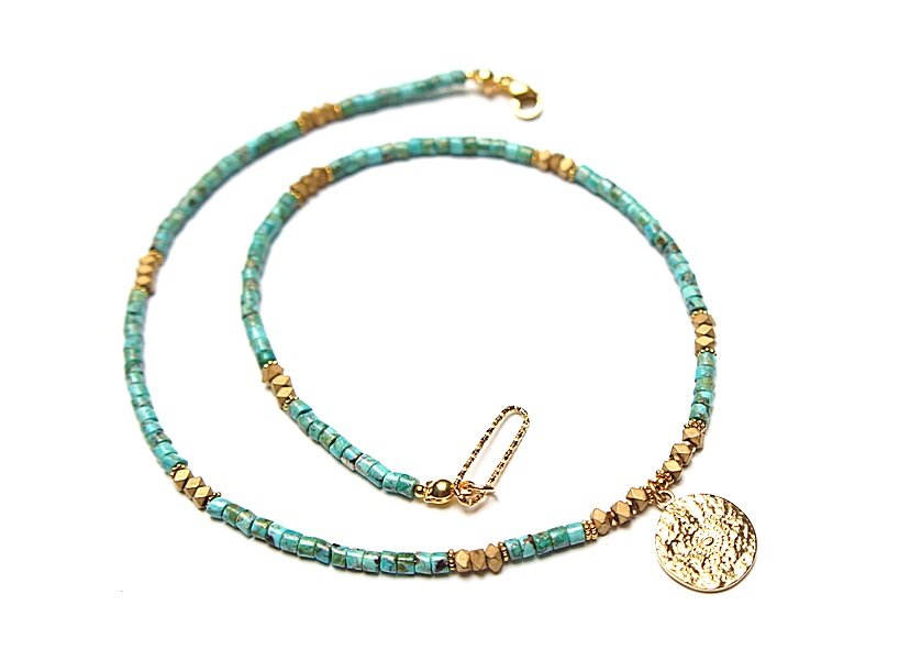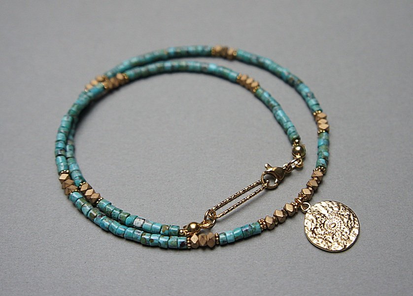 Krótki naszyjnik wykonany w całości z pozłacanej stali szlachetnej oraz kamieni - talarki naturalnych turkusów [4 x 2mm], talarki matowego hematytu [3 x 2mm]. Naszyjnik o długości ok. 43,5cm.