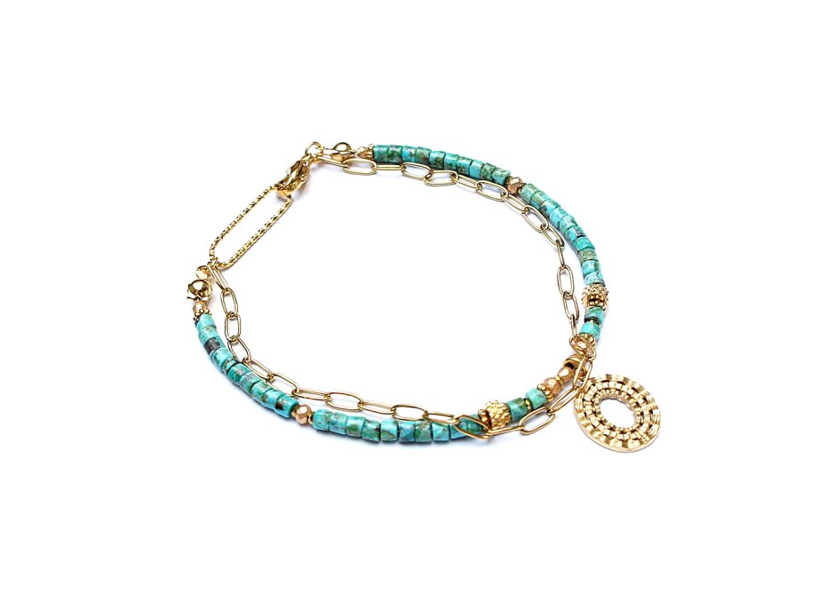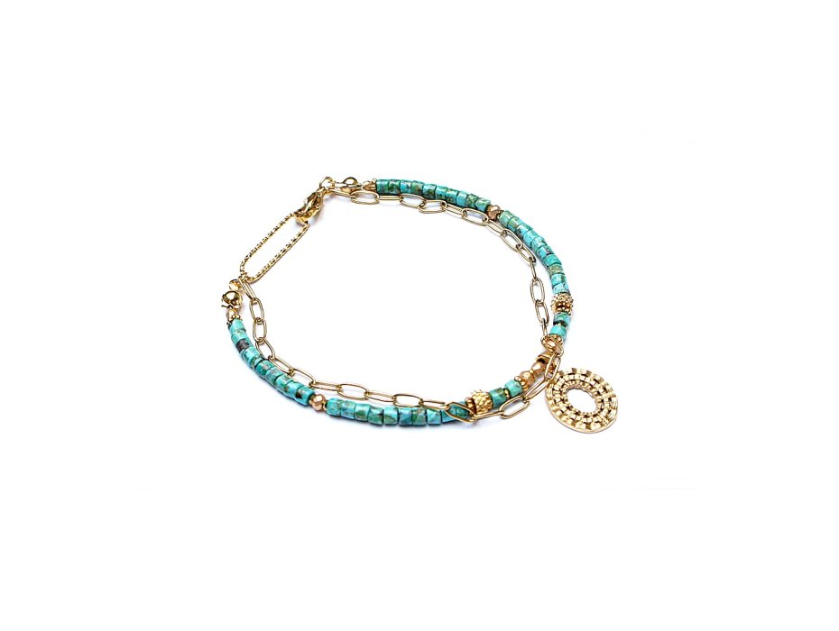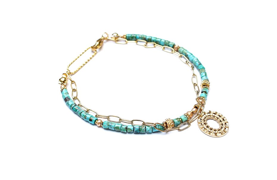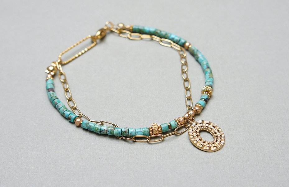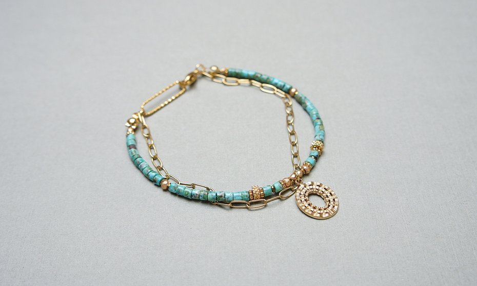 Bransoletka wykonana ze stali szlachetnej pokrytej zlotem oraz naturalnych kamieni - talarków turkusu [3 x 2mm], talarków matowego hematytu [3 x 2mm], hematytu fasetowanego, platerowanego 3 i 2mm]. Całkowita długość bransoletki: 19cm. Biżuteria ozdobnie zapakowana