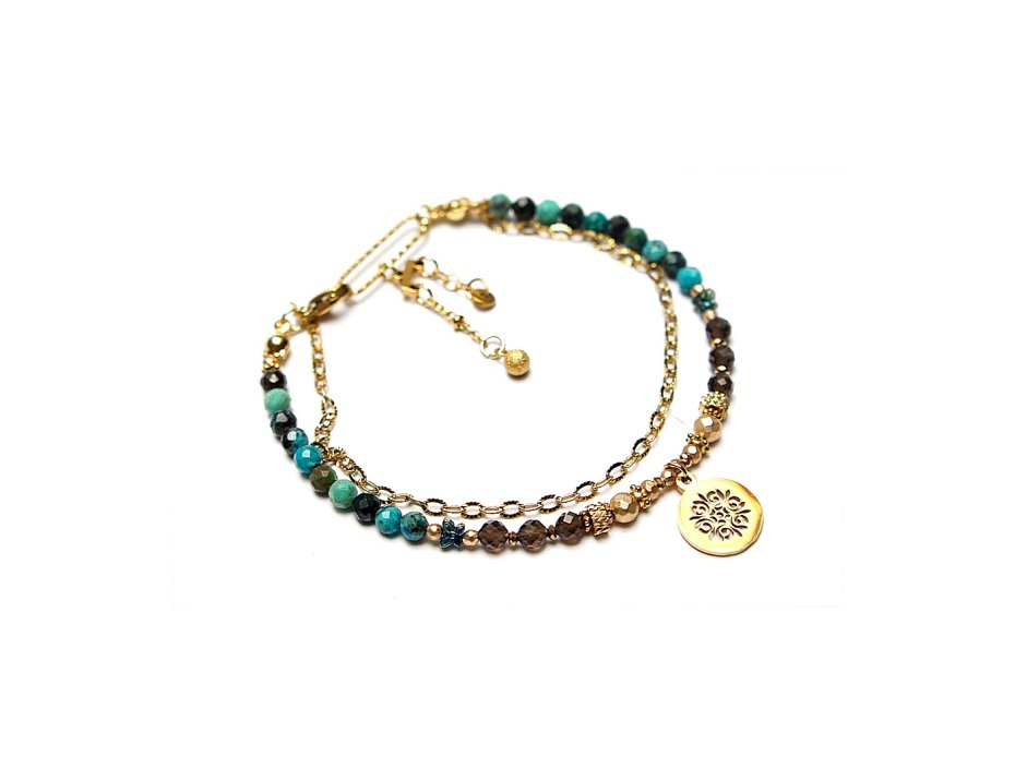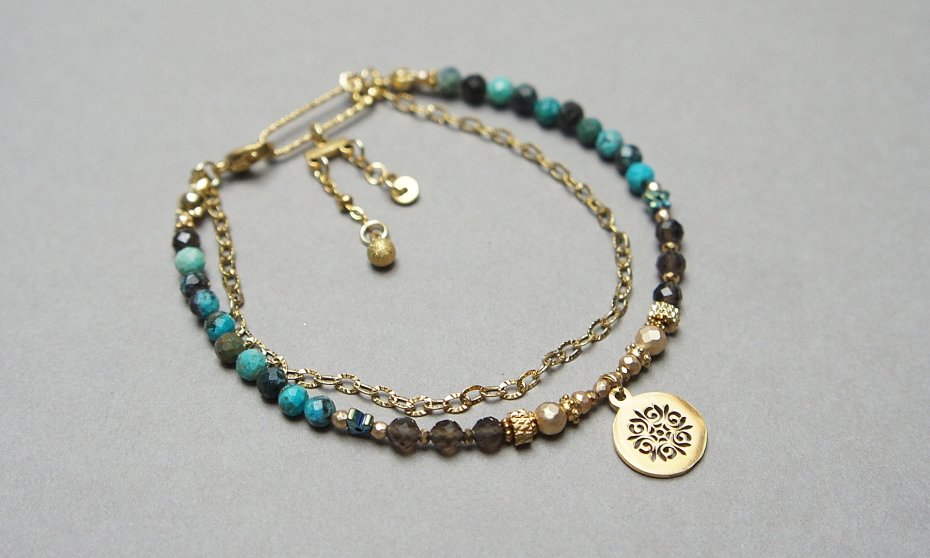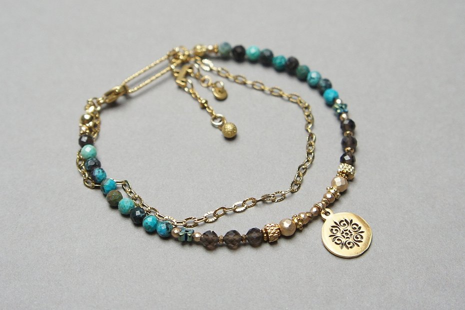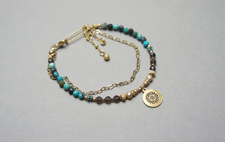 Delikatna bransoletka wykonana w całości ze stali szlachetnej pozłacanej, szlachetnych kamieni - naturalnych turkusów [4mm], fasetowanego kwarcu dymnego [4mm], hematytów platerowanych, fasetowanych [2mm, 3mm i 4mm], przekładek z hematytu [4mm - motyle i 1mm]. Całkowita długość bransoletk1 ok. 18cm.