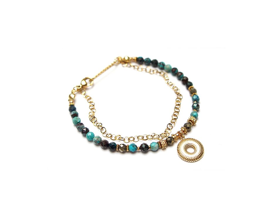 Delikatna bransoletka wykonana w całości ze stali szlachetnej pozłacanej, szlachetnych kamieni - naturalnych turkusów [4mm], fasetowanych pirytów o surowym wyglądzie [3,5mm], hematytów platerowanych, fasetowanych [2mm], przekładek z hematytu [1mm]. Całkowita długość bransoletk1 ok. 18cm.