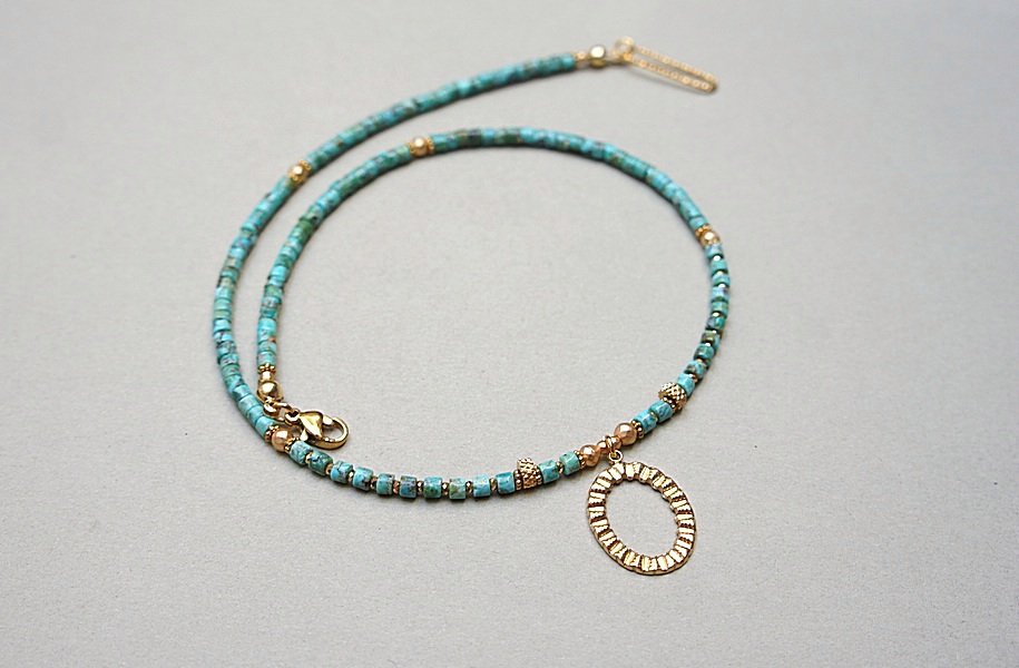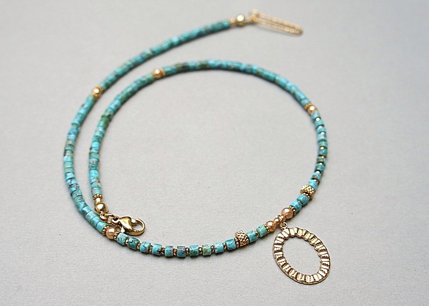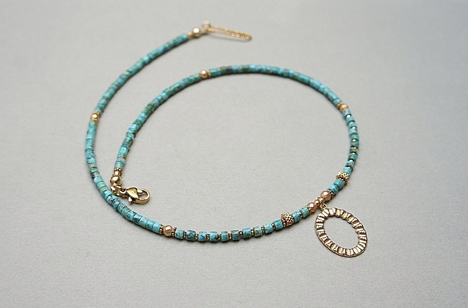 Krótki naszyjnik wykonany w całości z pozłacanej stali szlachetnej oraz kamieni - talarki naturalnych turkusów [4 x 2mm], fasetowanego, platerowanego hematytu [2mm i 3mm] oraz przekładek z hematytu [1mm]. Naszyjnik o długości ok. 41,5cm. Biżuteria ozdobnie zapakowana.