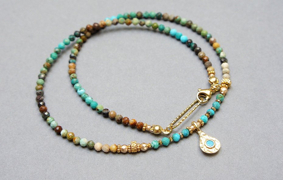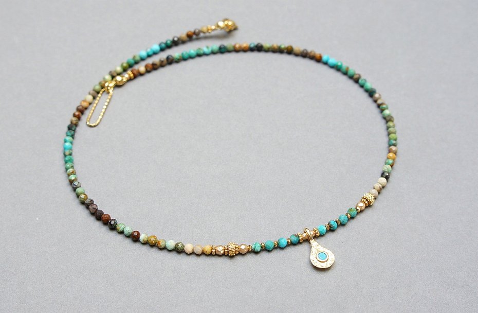 Krótki, delikatny naszyjnik wykonany w całości z pozłacanej stali szlachetnej oraz szlachetnych kamieni - kuleczki naturalnych turkusów [3mm], przekładek z hematytu [1mm], fasetowanych, platerowanych hematytów [2mm i 3mm]. Naszyjnik o długości ok. 42,5cm.