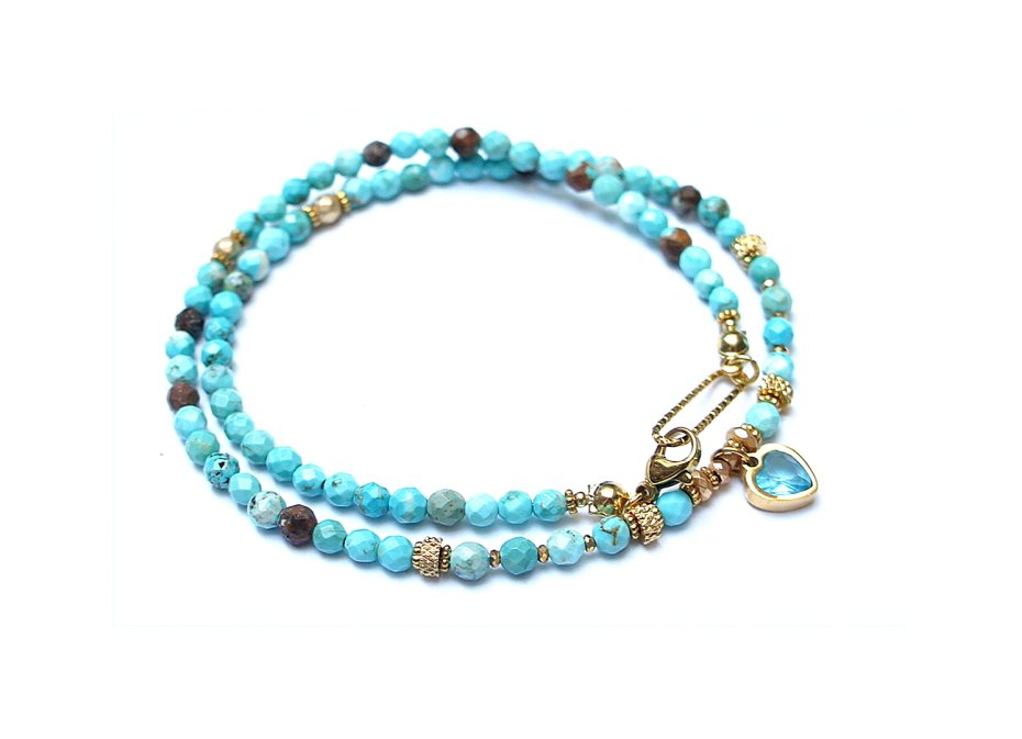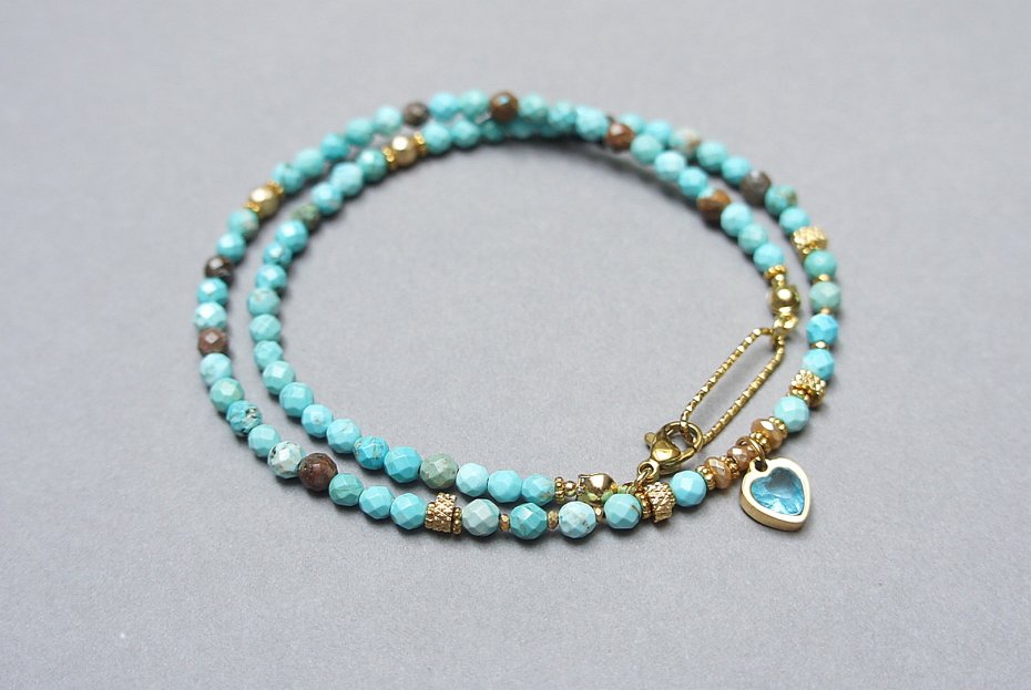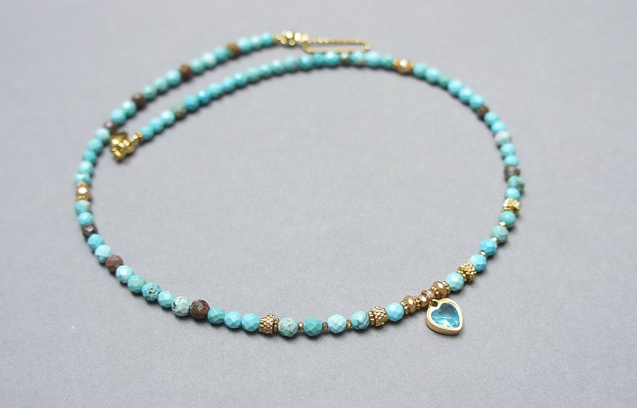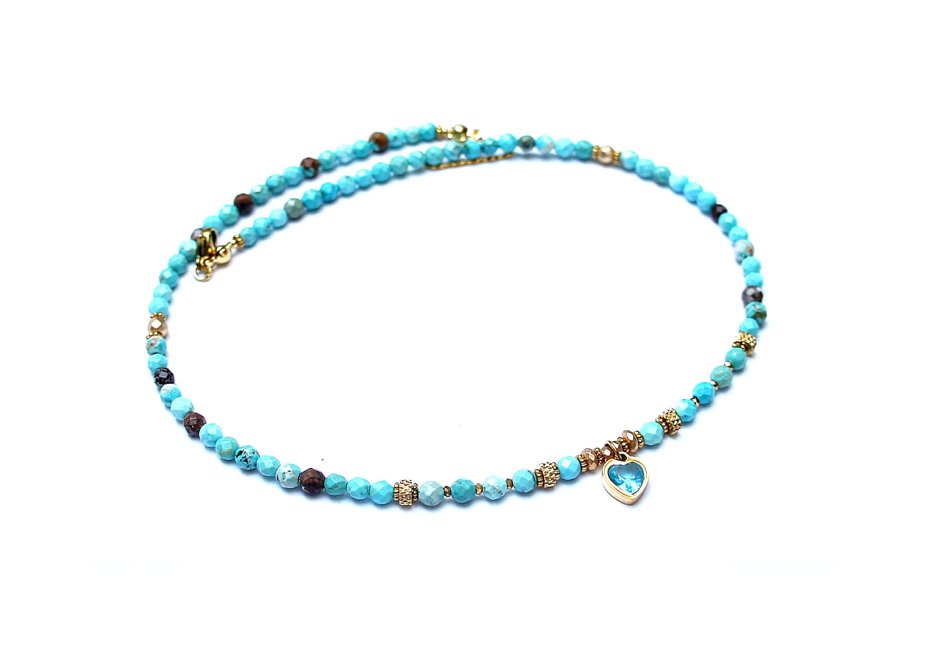 Krótki, delikatny naszyjnik wykonany w całości z pozłacanej stali szlachetnej oraz naturalnych kamieni - fasetowanych, turkusów [4mm], [przekładek z hematytu [3 x 2mm oraz 1mm] oraz zawieszki z cyrkonią w okuciu. Naszyjnik o długości ok. 42cm. Biżuteria ozdobnie zapakowana.