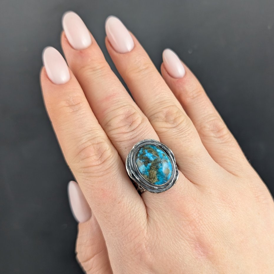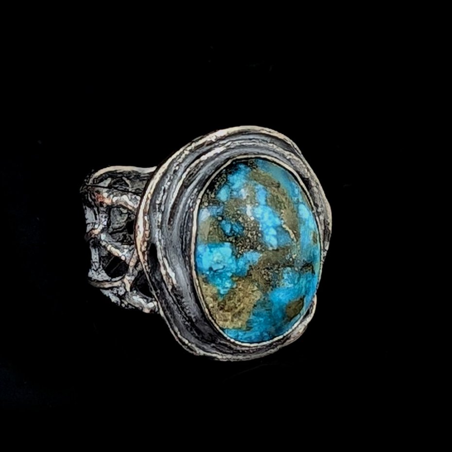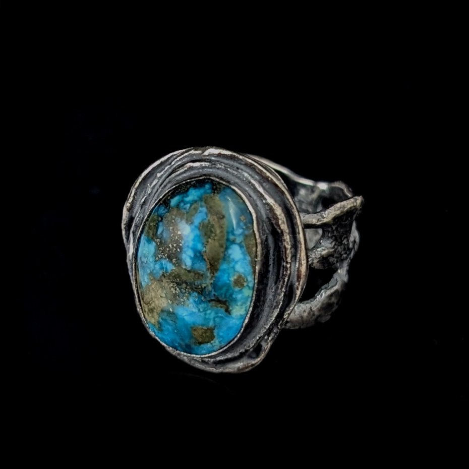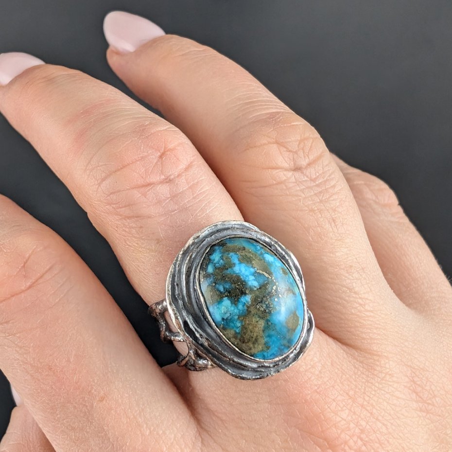 Pierścionek wykonany z ksydowanego srebra pr 925 oraz turkusu z Iranu o zjawiskowej błękitnej barwie. Jest piękny,ma wrosty pirytu w kolorze starego złota. Rozmiar obrączki 17, mogę powięszyć na max 18, proszę napisać na jaki ustawić. Oprawa 22 x 19 mm. Waga 12,8 g.