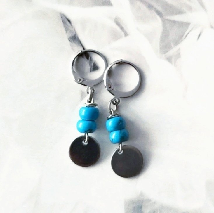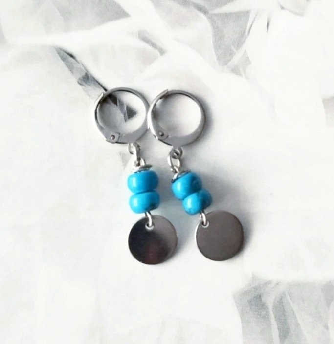 Kolczyki ze stali szlachetnej oraz oponek naturalnego turkusu .