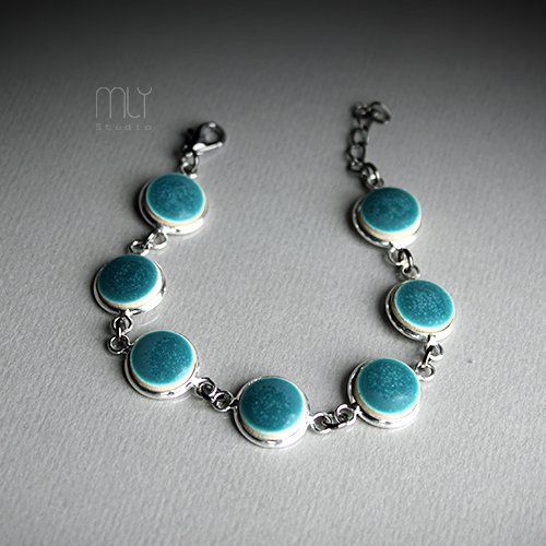 Efektowna bransoletka wykonana z ceramicznych elementów, szkliwionych zielonym matowym szkliwem, elementów metalowych w kolorze srebrnym. Obwód regulowany, średnica elementu ceramicznego około 12mm . Polecam . Termin realizacji zamówienia to 1-2 dni.