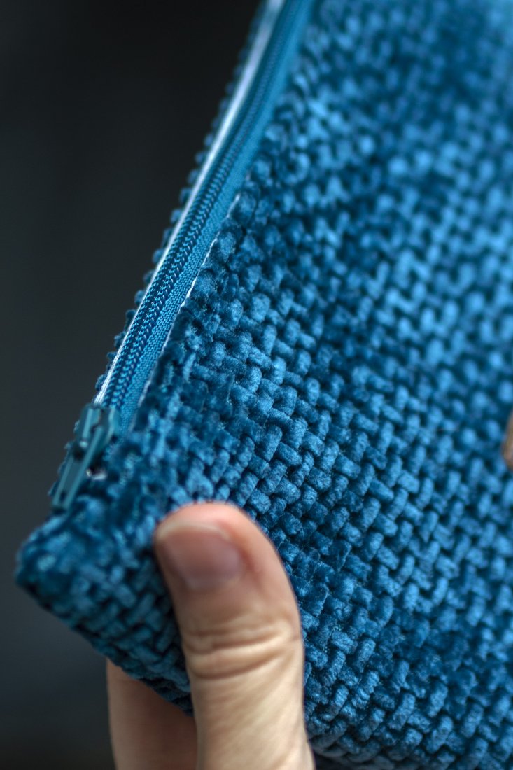 Średniej wielkości kosmetyczka wykonana z turkusowego tłoczonego weluru.