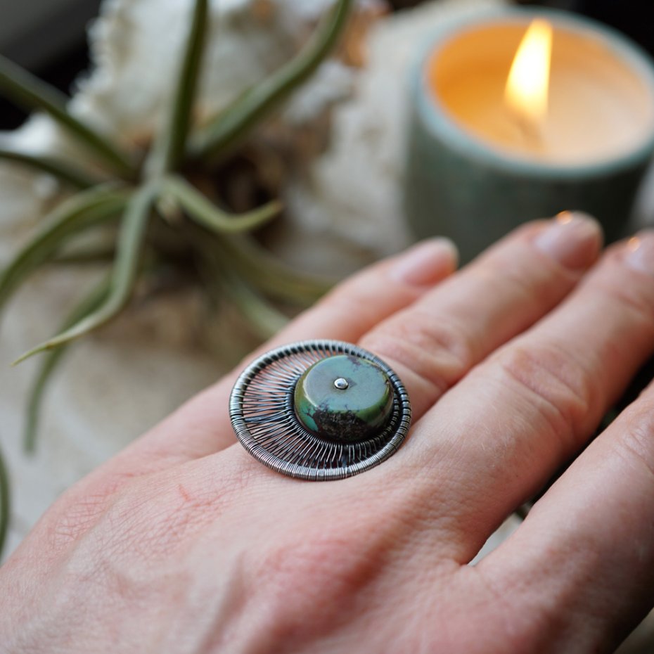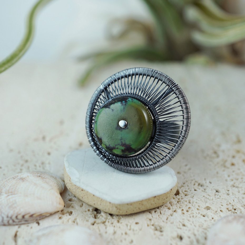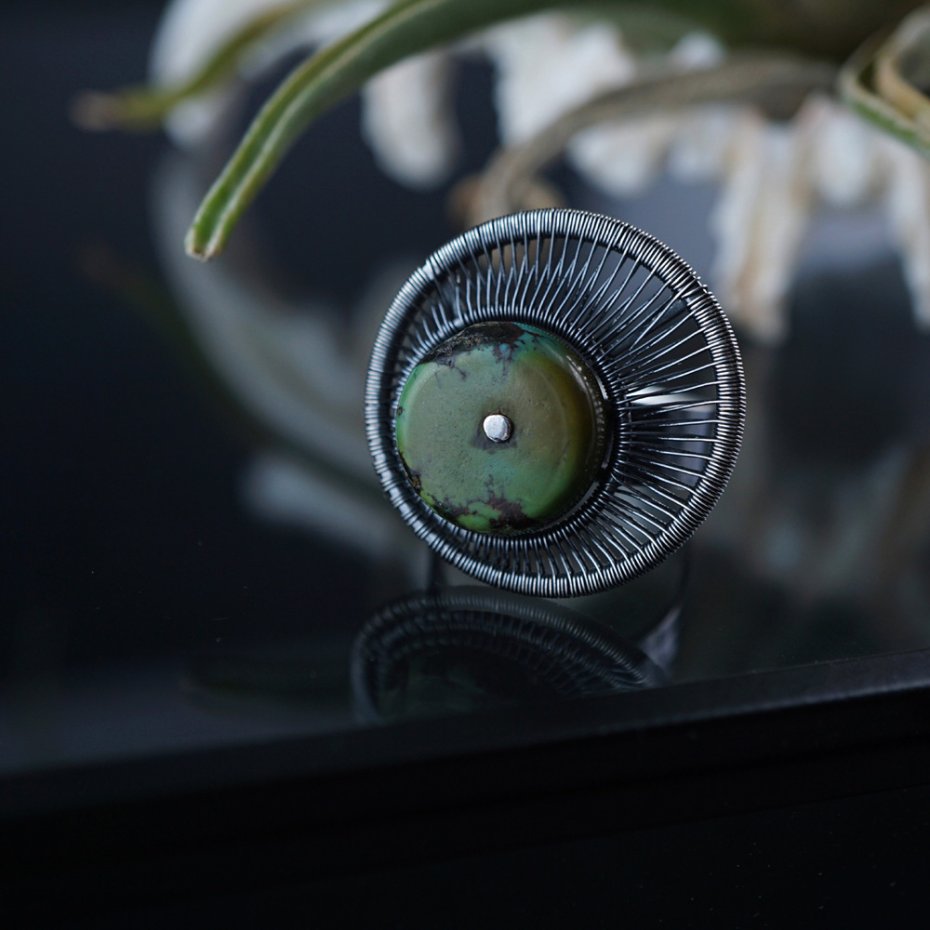 Stworzyłam go od podstaw, z wykorzystaniem klasycznych technik jubilerskich oraz mojej ulubionej techniki wire wrapping, ze srebra próby 925 oraz gładkiego krążka turkusu. Całość mocno oksydowana (przyciemniana), polerowana i miejscami przecierana.