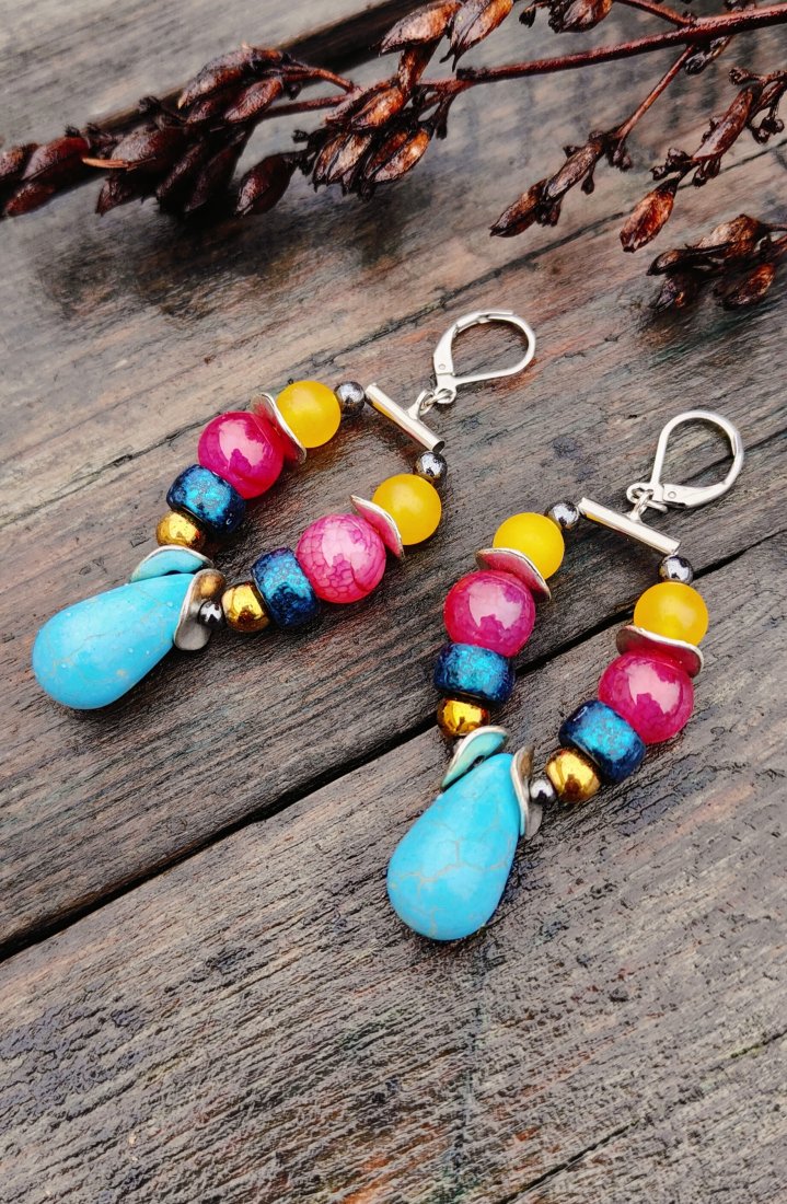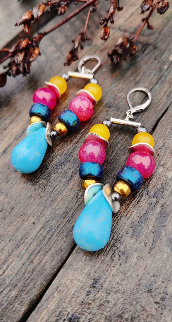 ,, turkusowa łezka,, to kolorowe kolczyki wykonane z turkusu, różowego turmalinu, złotego i czarnego hematytu, żółtego matowego jadeitu. Kolczyki zawieszone są na ozdobnych biglach typy angielskiego wykonanych ze stali szlachetnej.