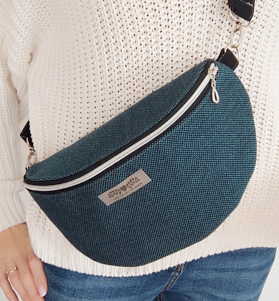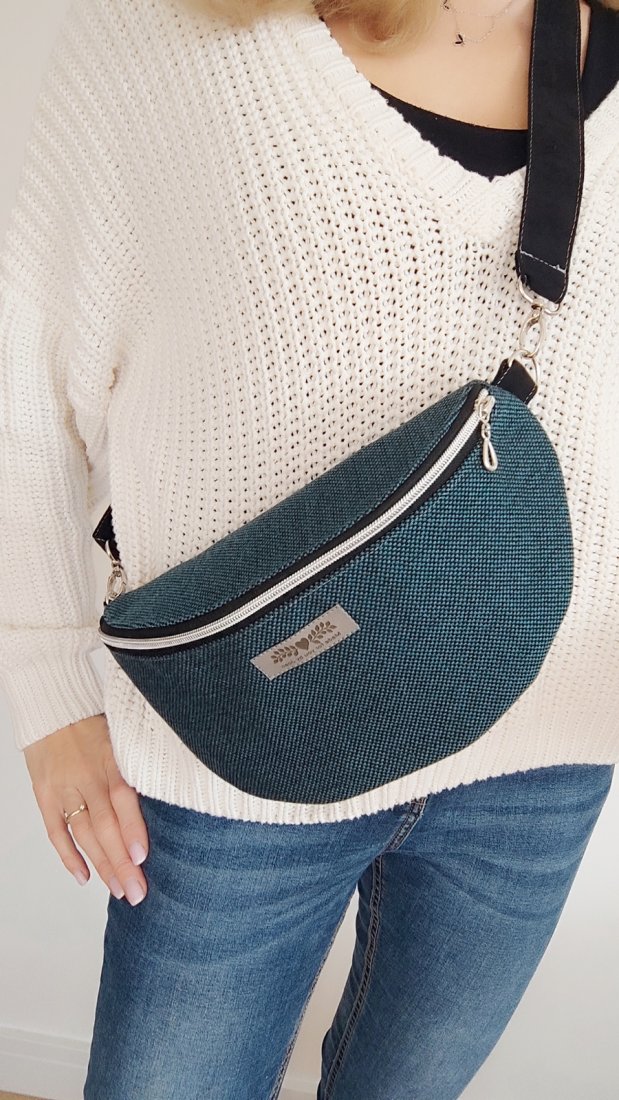 Nerka, saszetka do noszenia na ramieniu z regulowanym paskiem, zapinana na suwak, w środku mała kieszonka na suwak.