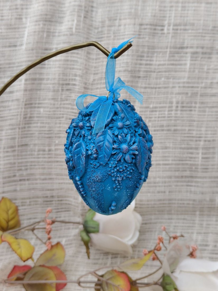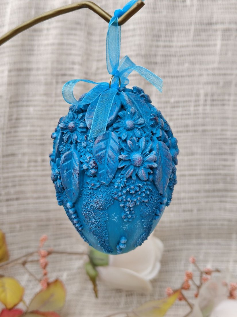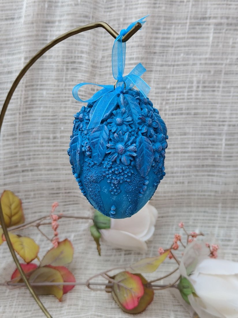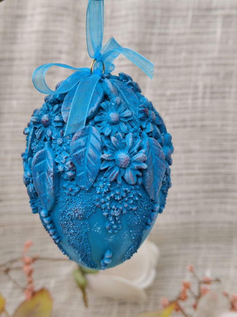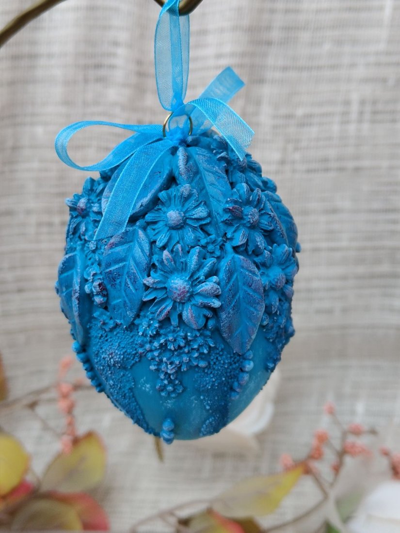 Zachwycająca, ręcznie zdobiona pisanka w intensywnym odcieniu turkusu to propozycja dla osób ceniących wyraziste, a zarazem eleganckie dekoracje wielkanocne. Jej powierzchnię pokrywają przestrzenne motywy kwiatowe i liściaste, tworzące bogatą, trójwymiarową kompozycję. Subtelne cieniowania i delikatne przetarcia podkreślają detale, nadając całości artystycznego charakteru i głębi.