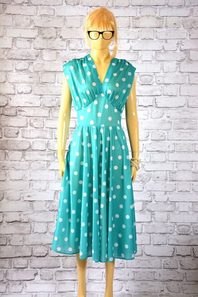 Piękna sukienka w stylu retro w kolorze turkusowym w białe grochy,dół sukienki o mocno rozkloszowanym kroju, góra sukienki bardziej dopasowana ,w talii wszyto szerszy pas w kształcie " piramidy "- szerokości 18 cm, z boku zapięcie na suwak, całość na podszewce.