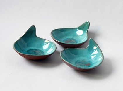 Komplet trzech ceramicznych miseczek o oryginalnej nieregularnej formie, inspirowanej motywami biologicznymi, ręcznie wykonanych z mocno spieczonej czerwonobrunatnej gliny kamionkowej. Miseczki jednostronnie szkliwione efektownym turkusowym błyszczącym szkliwem efektem drobnych plamek i lekkiej krystalizacji na dnie, spód gładki matowy w kolorze brunatnej czerwieni. Średnica ok 9,5cm, wysokość ok 4cm. Polecam
