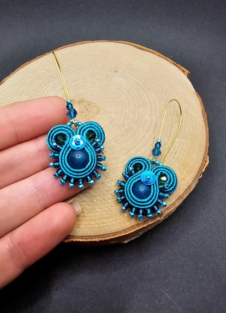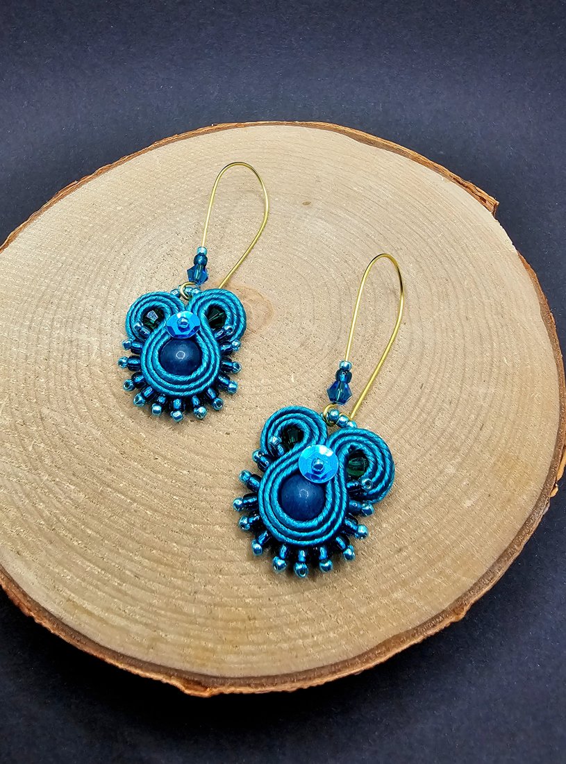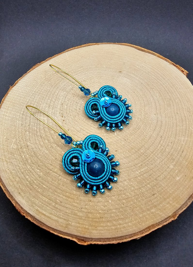 Ciemno turkusowe kulki jadeitu otoczone sznurkami sutasz oraz szklanymi koralikami TOHO i niewielkimi kryształami. Kolczyki zawieszone na długich zamykanych biglach w kolorze złotym.