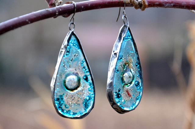Niezwykłe, niepowtarzalne kolczyki ze szkłem. Oprawa w kolorze starego srebra nadają kolczykom uroku. Długość całego kolczyka to ok. 6,5 cm. Biżuteria w 100% wykonana ręcznie, poszczególne sztuki mogą się minimalnie różnić.