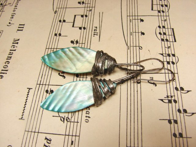 Kolczyki wykonane ręcznie z turkusowych płatków masy perłowej lutowane przy użyciu stopu cyny i srebra . Kołczyki stylizowane na stare srebro i ręcznie polerowane. Długość wraz z biglem ok 7 cm - zawieszone na srebrnych zamykanych biglach. Zapraszam do zakupu..