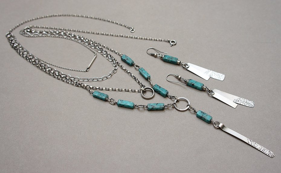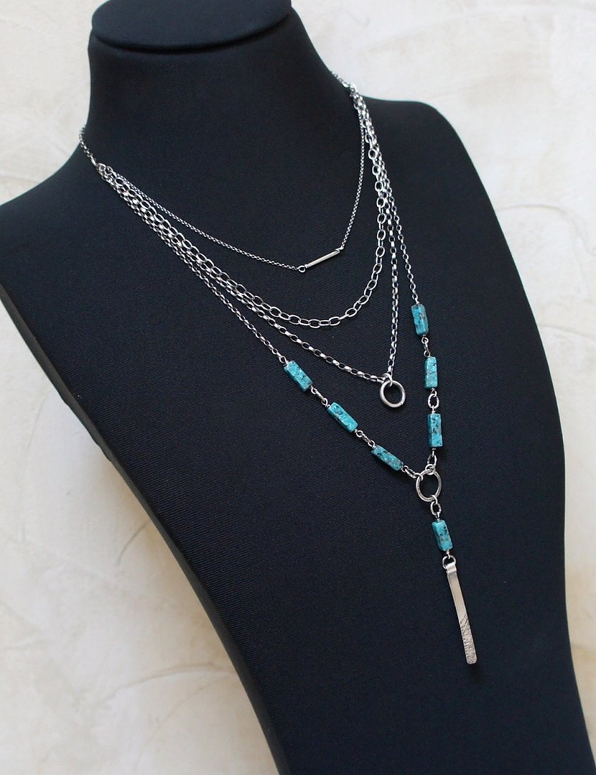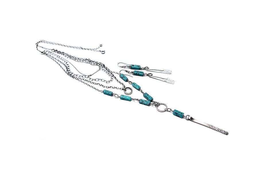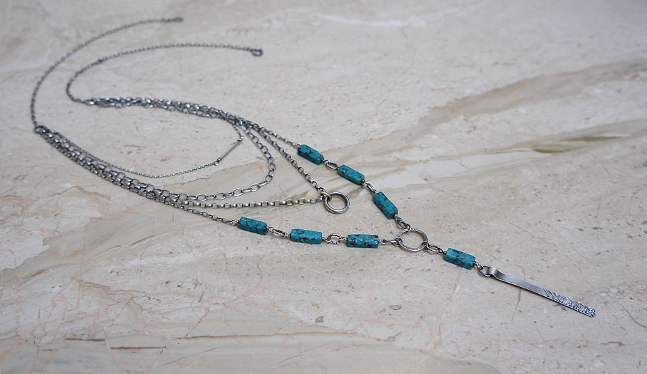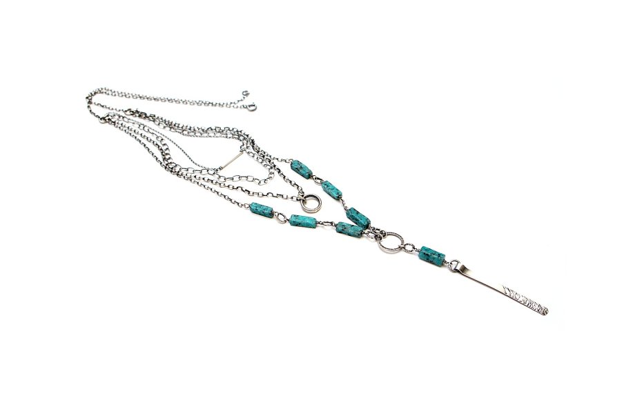 Naszyjnik czterorzędowy wykonany ze srebra [pr. 925] w połączeniu ze słupkami howlitów [13mm x 4mm]. Całość oksydowana i przetarta. Całkowita długość naszyjnika najdłuższego łańcuszka 62,5cm, najkrótszego 45cm. Długość przedniej części wiszącej 9cm. Biżuteria ozdobnie zapakowana.