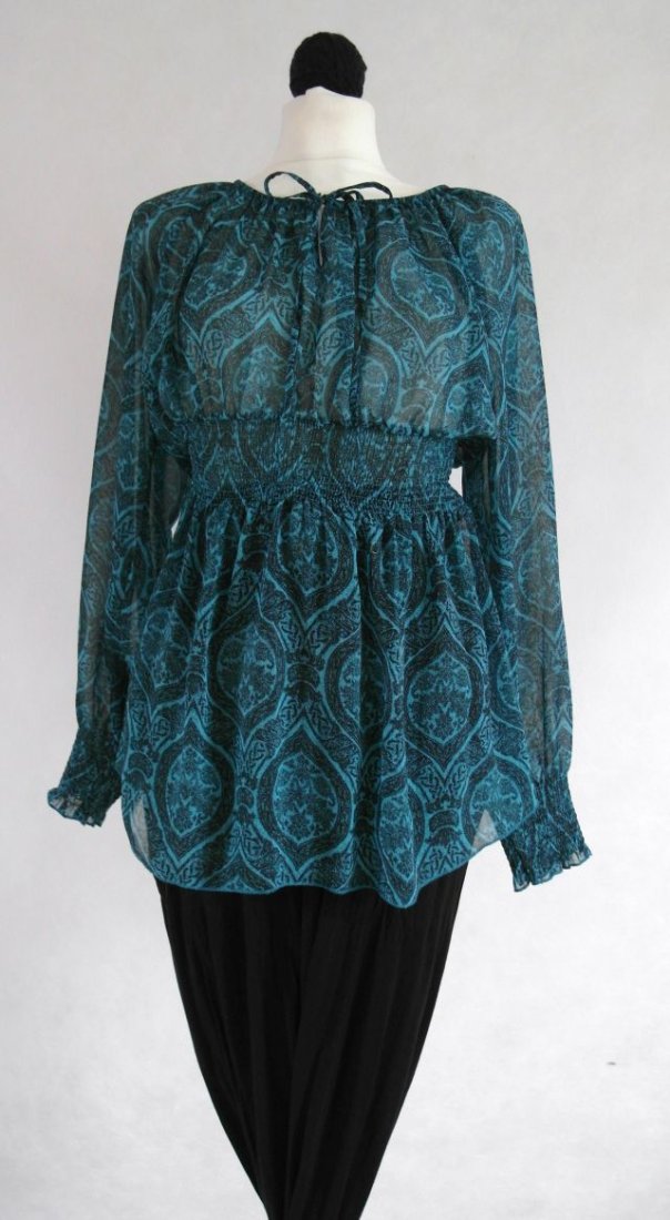 kolor - ciemny turkus w arabskie wzory.Przy szyi wiązana, dekolt z gumką- można go obniżyć na ramiona. Szeroki pas gumowany oraz mankiety również zakończone gumką.Bardzo ładnie się układa, lekko zwiewna, stan idealny.