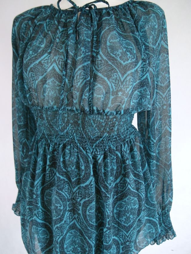 kolor - ciemny turkus w arabskie wzory.Przy szyi wiązana, dekolt z gumką- można go obniżyć na ramiona. Szeroki pas gumowany oraz mankiety również zakończone gumką.Bardzo ładnie się układa, lekko zwiewna, stan idealny.