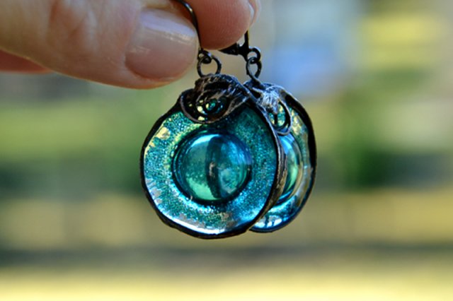 Romantyczne kolczyki ze szkłem. Oprawa w kolorze starego srebra nadają kolczykom uroku. Długość całego kolczyka to ok. 5 cm. Biżuteria w 100% wykonana ręcznie, poszczególne sztuki mogą się minimalnie różnić.