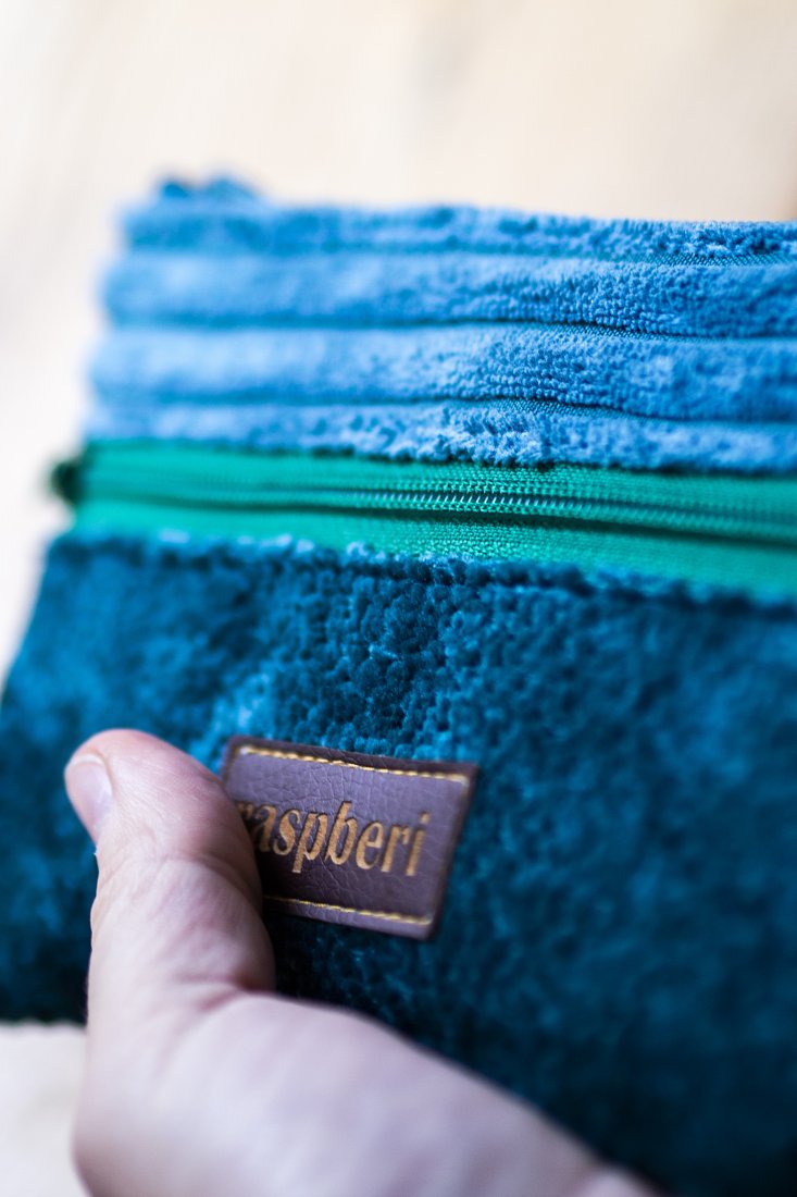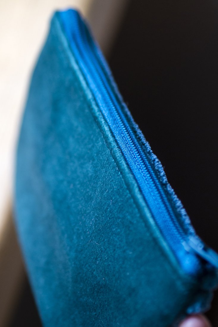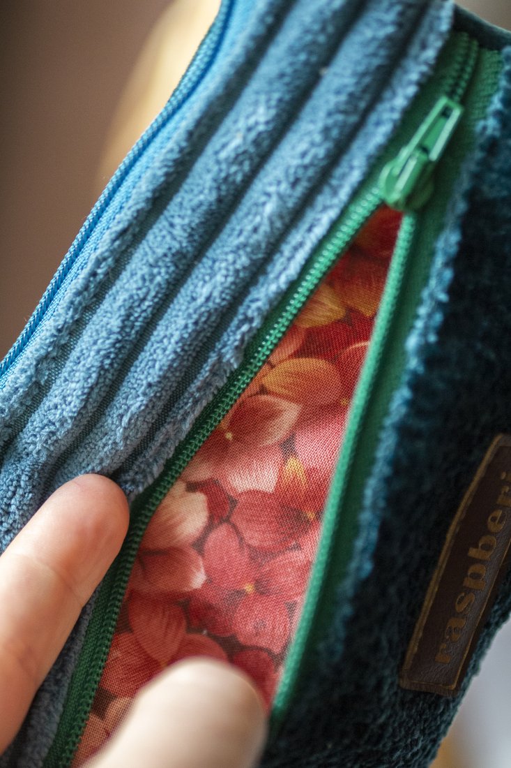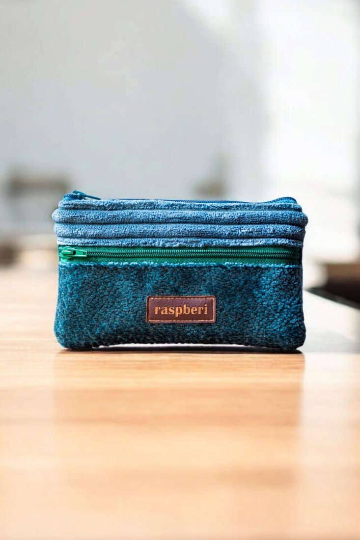 Prosty wodoodporny portfel wykonany z turkusowego i zielonego weluru oraz grubego sztruksu.