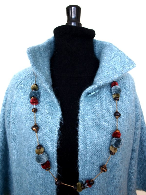 Turkusowy sweter/ narzutka z mieszanki akrylu z moherem z zapięciem na jeden guzik pod szyją. Fason lekko rozkloszowany z dwiema kieszonkami z przodu . Rękawy 3/4 raglanowe również rozszerzane do dołu. Pod szyją kołnierz w formie wyższej stójki. Włóczka bardzo przyjemna w dotyku, miła nie gryząca.