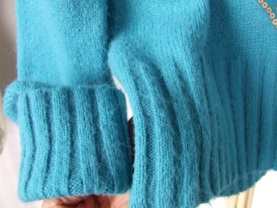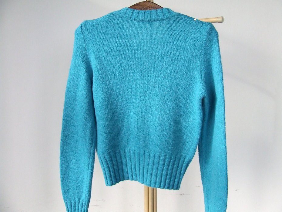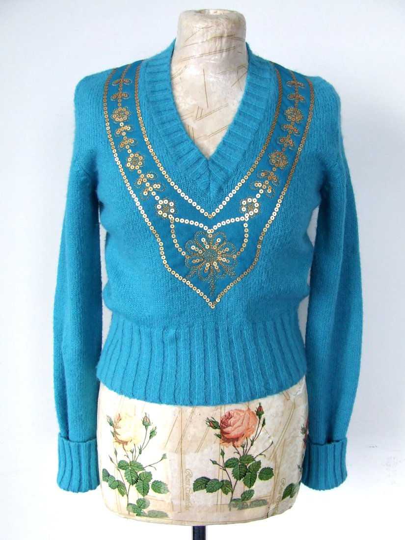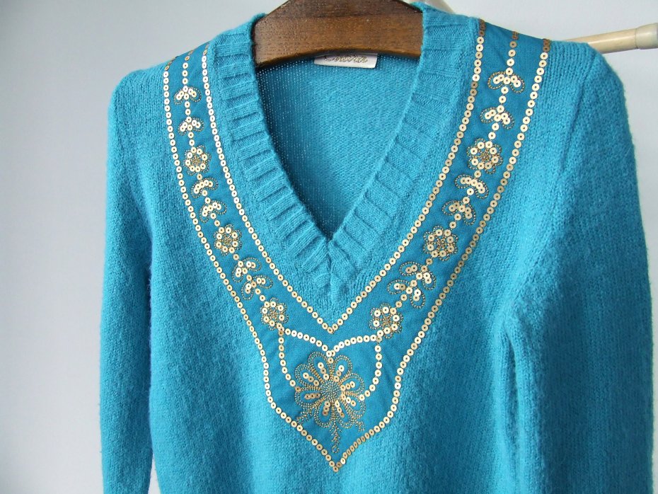 vintage ciepły turkusowy sweter z dekoltem w serek, ozdobiony matowymi cekinami, styl retro