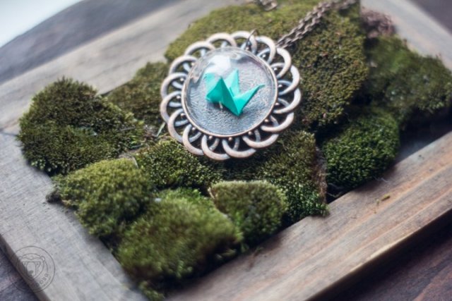 Delikatny, maleńki, papierowy żuraw - japoński symbol szczęścia, zdrowia i pokoju. Podobno, jeśli w jakiejś intencji złoży się tysiąc żurawich figurek, to życzenie się spełni. My spełniamy życzenia tym zjawiskowym wisiorkiem. Papierowego żurawia skrywa szklana kopułka o średnicy 3 cm. Całość zawieszona na łańcuszku z regulacją o max.długości 42 cm. Ozdobna baza i łańcuszek w kolorze miedzi.