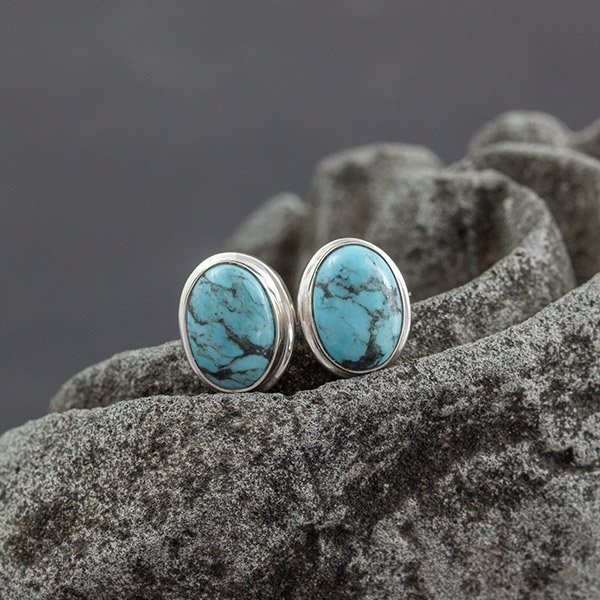 Turkus (7x10mm) oprawiony w srebro próby 925. Wielkość kolczyków 9x12mm. Kolczyki są ozdobnie zapakowane.