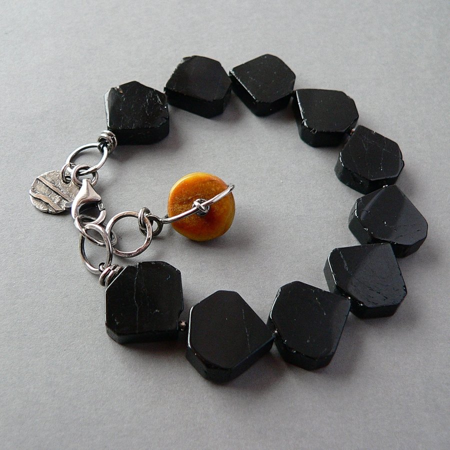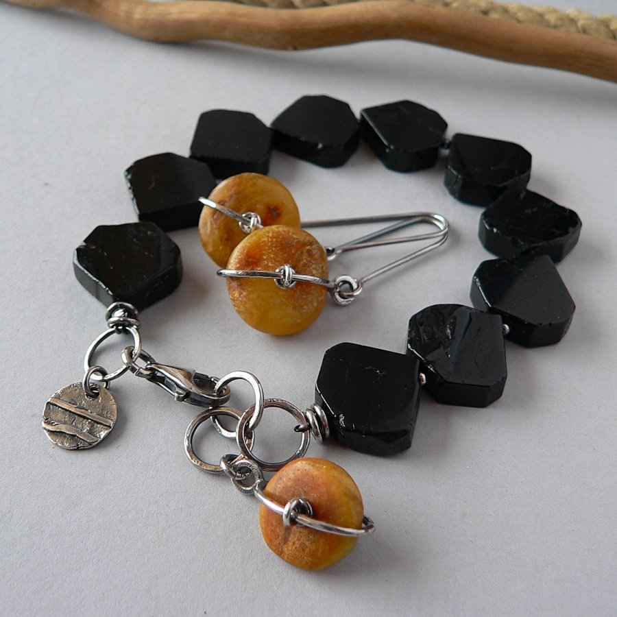 Bransoletka wykonana czarnych turmalinów, bursztynu i srebra. Srebro fakturowane, oksydowane, detale polerowane. Wymiary płytki turmalinu- 1,7/1,6/0,4 cm, średnica bursztynu 1,6 cm Bransoletka pasuje na nadgarstek o obwodzie 17-18,5 cm