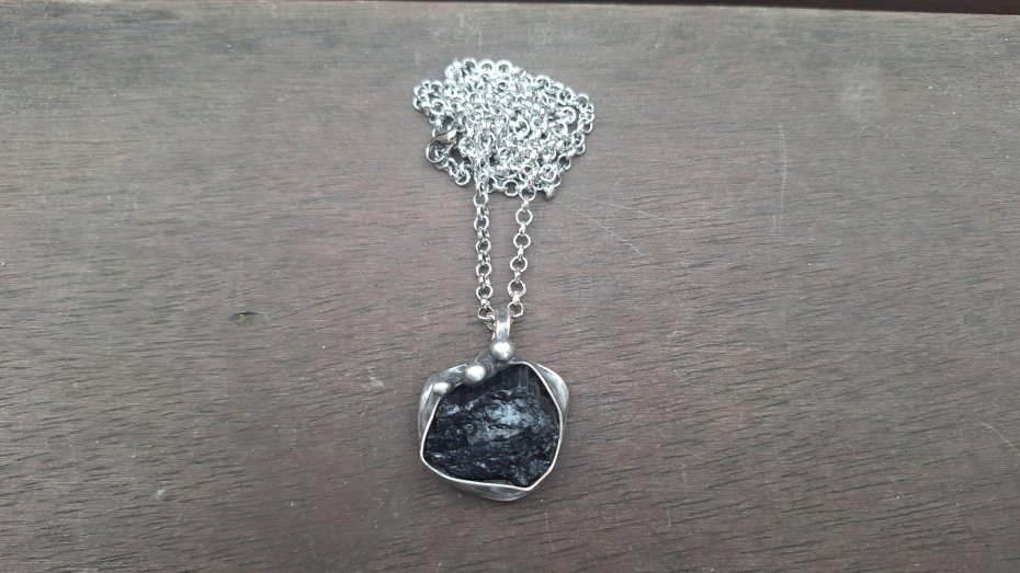 Wisiorek wykonany z miedzi, cyny i surowego, czarnego turmalinu. Wymiary ok. 2.5 na 2.5 cm. Łańcuszek o długości ok. 50 cm.