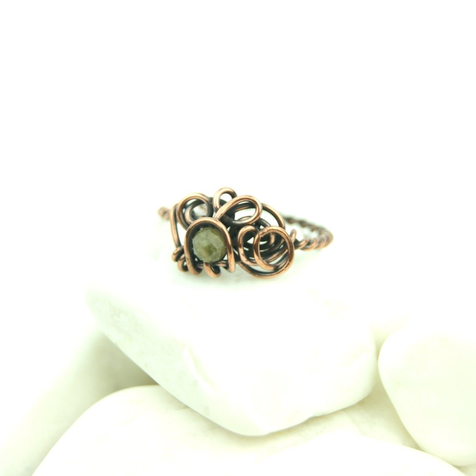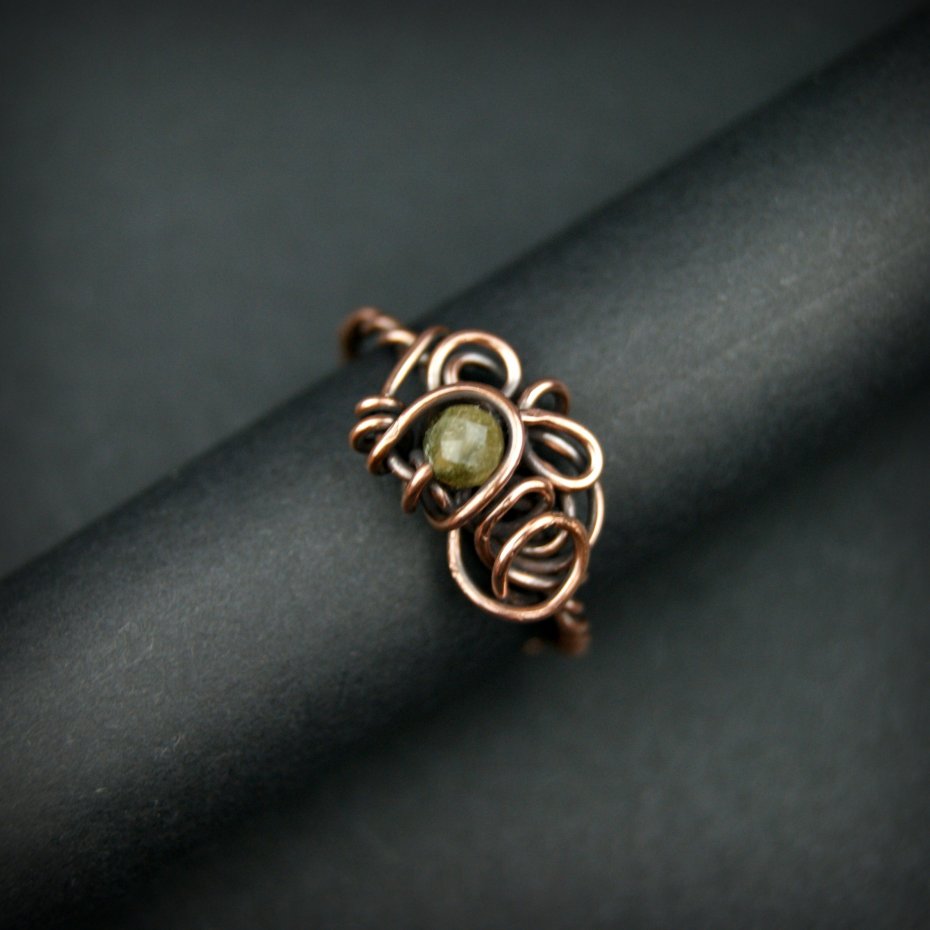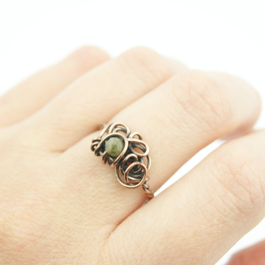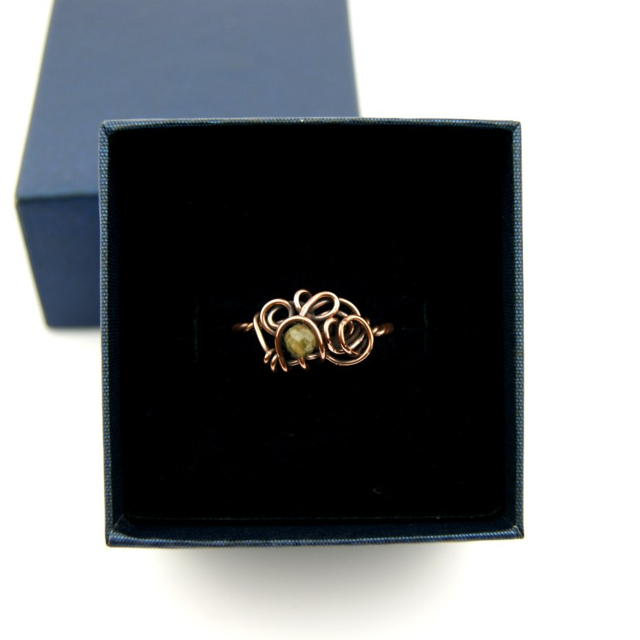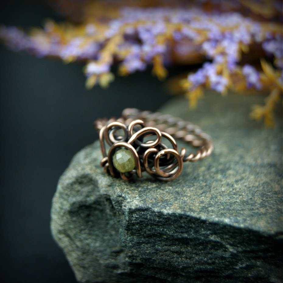 Pierścionek wykonany w pracochłonnej technice wire wrappingu. Centralnym punktem jest tu fasetowany turmalin w kolorze zielonym, który został misternie opleciony miedzią. Pierścionek w uniwersalnym rozmiarze, możliwość regulacji.