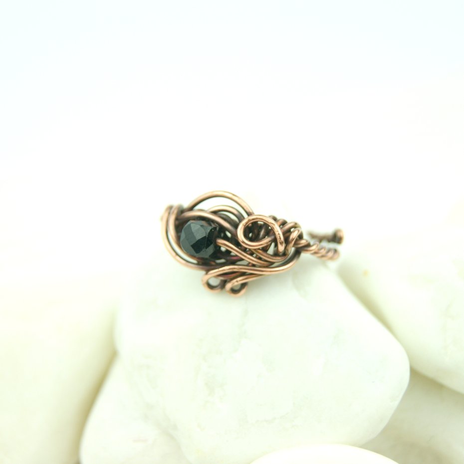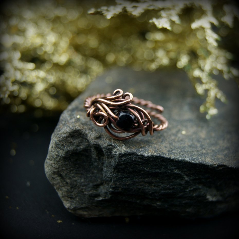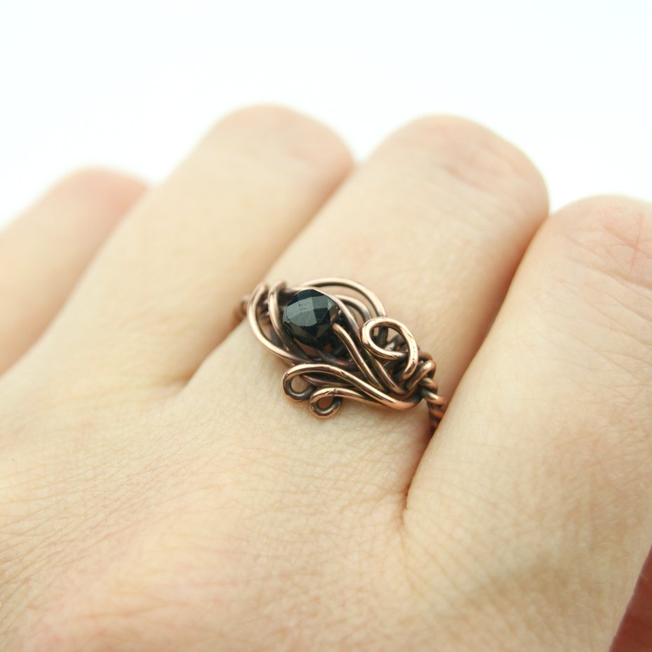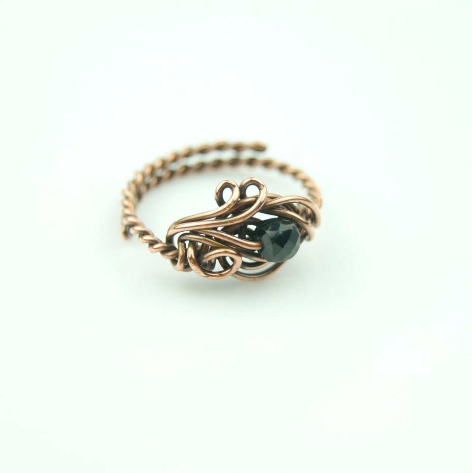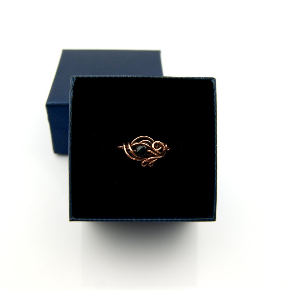 Pierścionek wykonany w pracochłonnej technice wire wrappingu. Centralnym punktem jest tu fasetowany turmalin w kolorze czarnym, który został misternie opleciony miedzią. Pierścionek w uniwersalnym rozmiarze, możliwość regulacji.