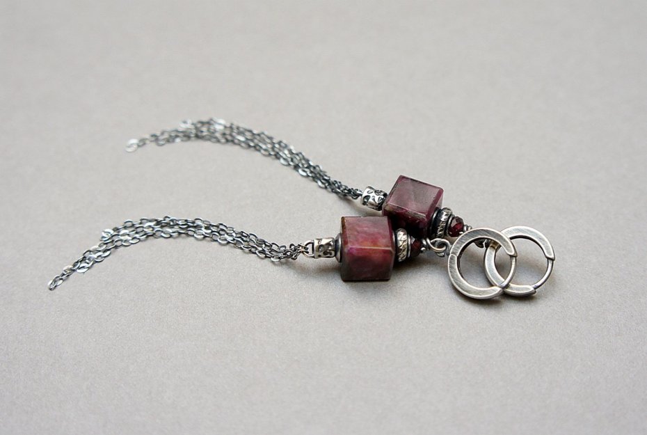 Kolczyki wykonane ze srebra [pr. 925] w połączeniu z kostkami bordowych turmalinów [9mm x 9mm], fasetowanymi kuleczkami granatów [4mm] oraz łańcuszkami. Całość oksydowana i przetarta. Całkowita długość kolczyków 9,3cm. Biżuteria ozdobnie zapakowana.