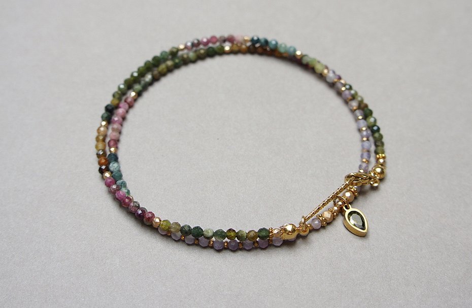 Krótki, delikatny naszyjnik wykonany w całości z pozłacanej stali szlachetnej oraz naturalnych, szlachetnych kamieni - fasetowanych turmalinów [2,5mm], fasetowanych, platerowanych hematytów [2mm i 3x2mm], przekładek z hematytu [1mm] oraz zawieszki z cyrkonią w okuciu. Naszyjnik o długości ok. 46,5cm.