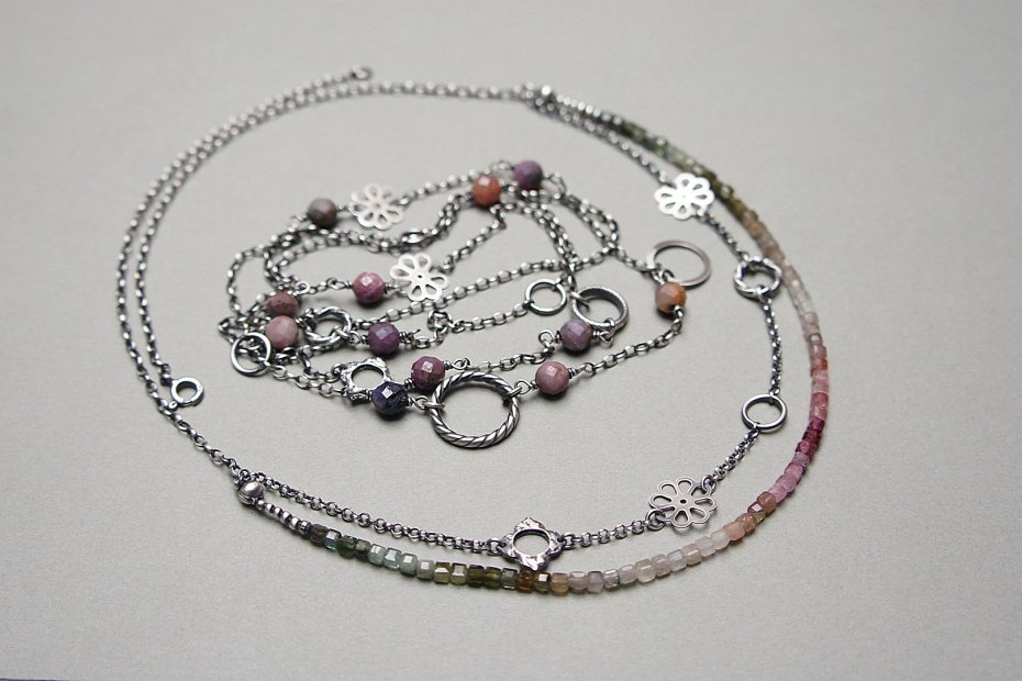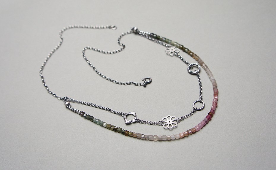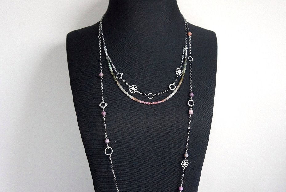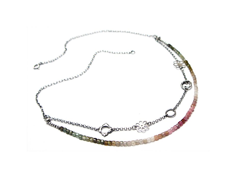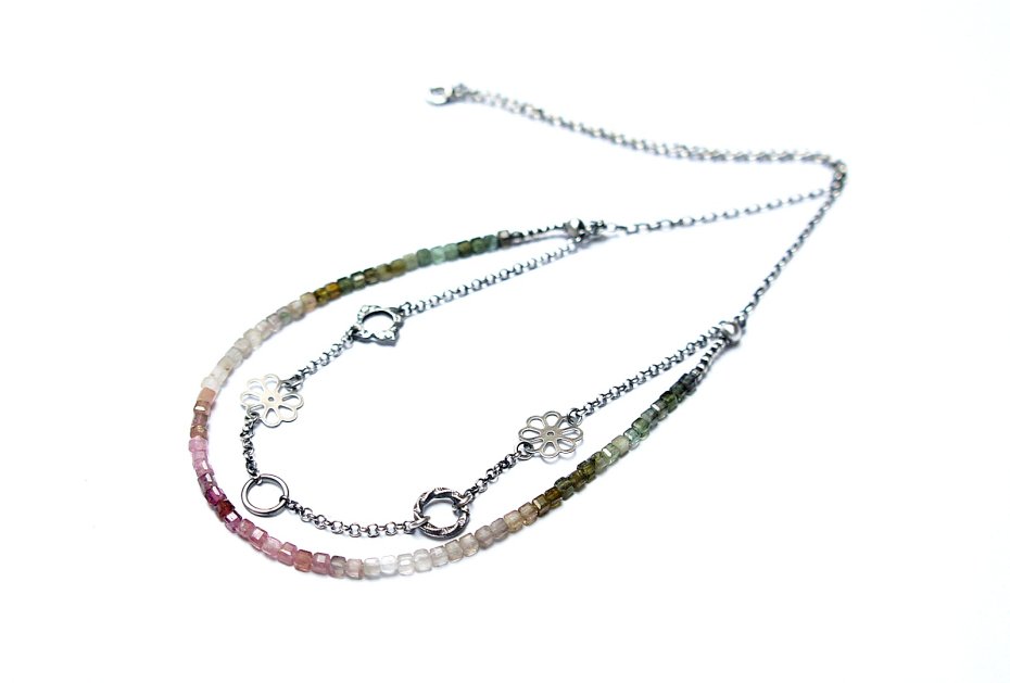 Naszyjnik dwurzędowy wykonany ze srebra [pr.925] w połączeniu z kostkami turmalinów [ok. 4mm] oraz srebrnymi kwiatuszkami i kółeczkami . Całość oksydowana i przetarta. Całkowita długość naszyjnika po dłuższym obwodzie 53,5cm. Biżuteria ozdobnie zapakowana.