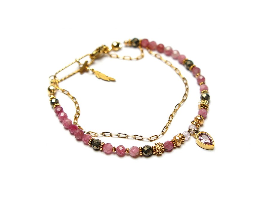 Delikatna bransoletka wykonana w całości ze stali szlachetnej pozłacanej, szlachetnych kamieni - turmalinów fasetowanych [4mm], pirytu fasetowanego o surowej strukturze [4mm], cyrkonii fasetowanych [2mm], hematytu fasetowanego, platerowanego [3 x 2mm oraz 2mm], przekładek z hematytu [1mm] oraz zawieszki z cyrkonią w okuciu. Całkowita długość bransoletki 18,5cm. Biżuteria ozdobnie zapakowana.