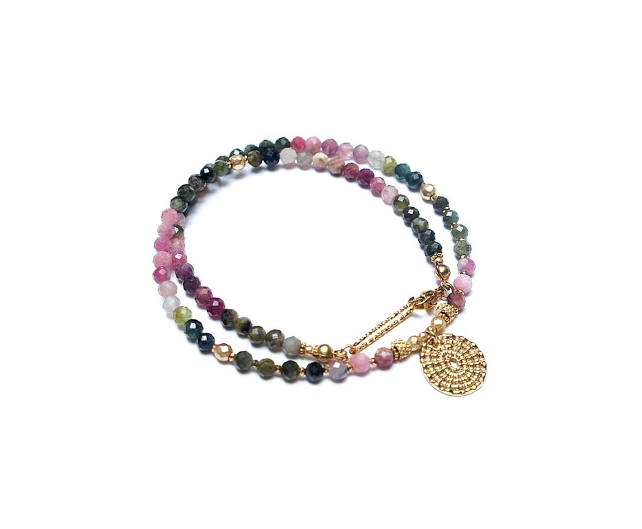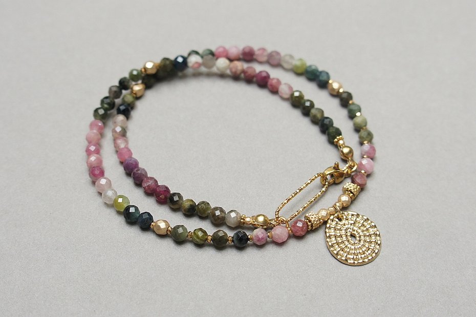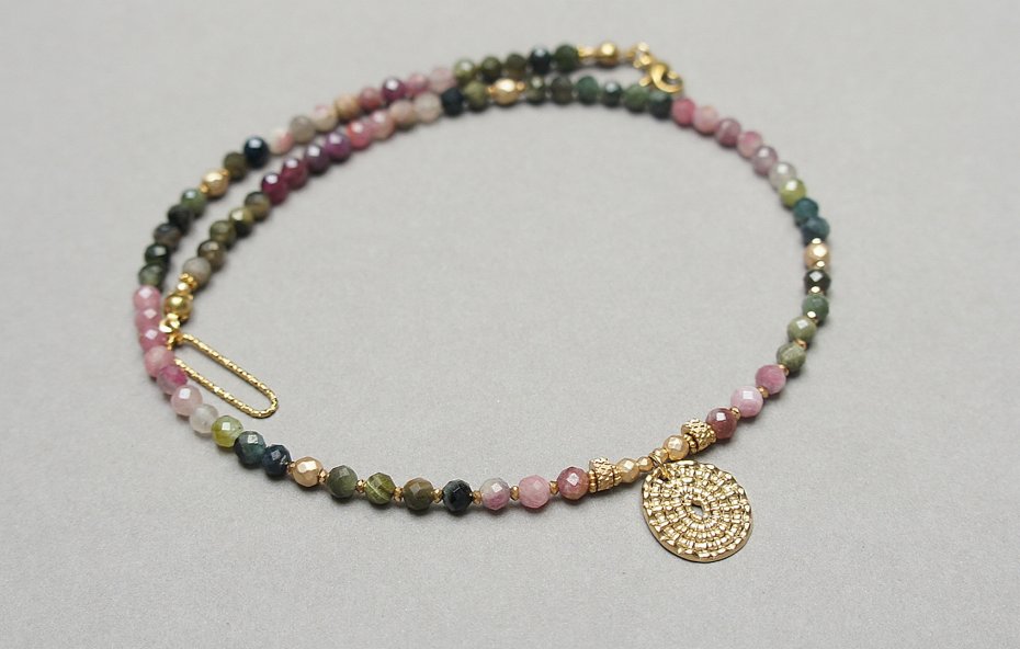 Krótki, delikatny naszyjnik wykonany w całości z pozłacanej stali szlachetnej oraz naturalnych, szlachetnych kamieni - fasetowanych turmalinów [4mm], hematytów fasetowanych, platerowanych [4mm i 2mm], przekładek z hematytu [1mm]. Naszyjnik o długości ok. 41cm.