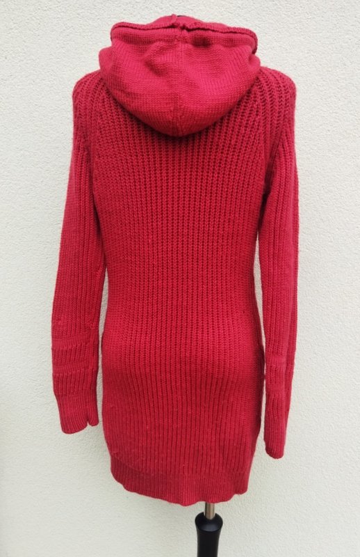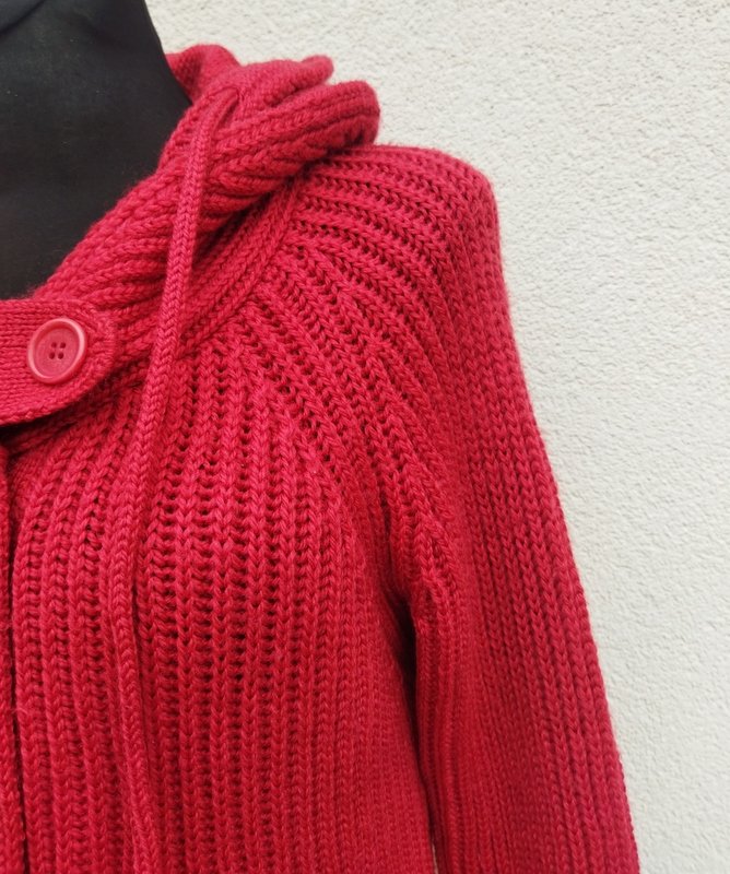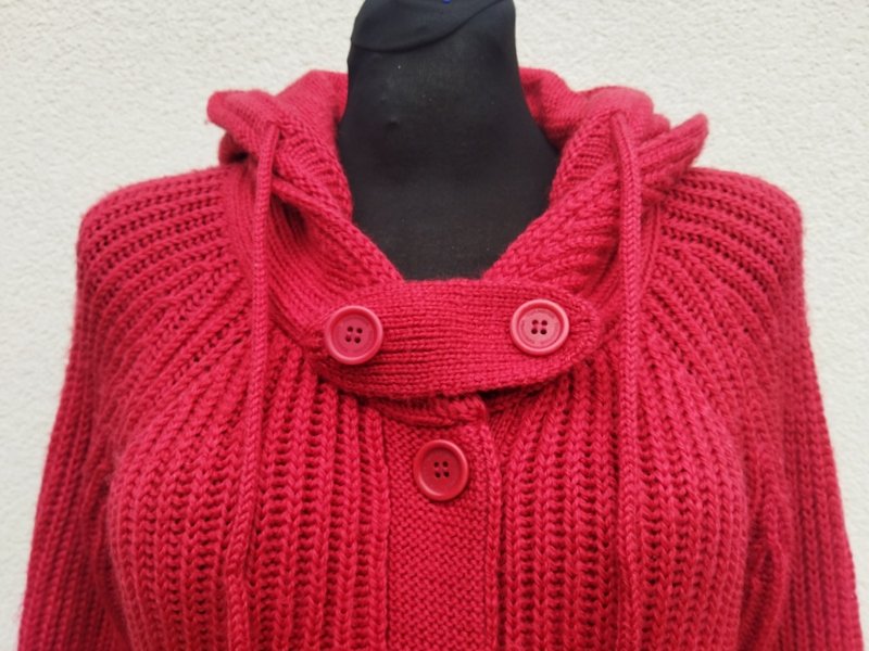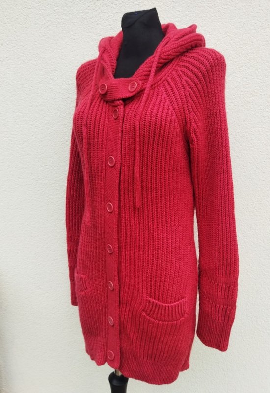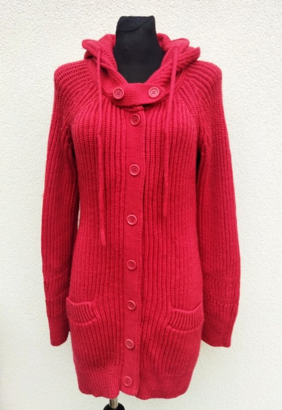 Fantastyczny dłuższy ciepły sweter z wełnianej włóczki wykonany mięsistym ściegiem angielskim. Z kapturem ściąganym troczkami, z raglanowymi rękawami, z dwiema wpuszczanymi kieszeniami. zapinany na guziki. Wykończony ściągaczami. Podatny i rozciągliwy. Zastąpi kurtkę.