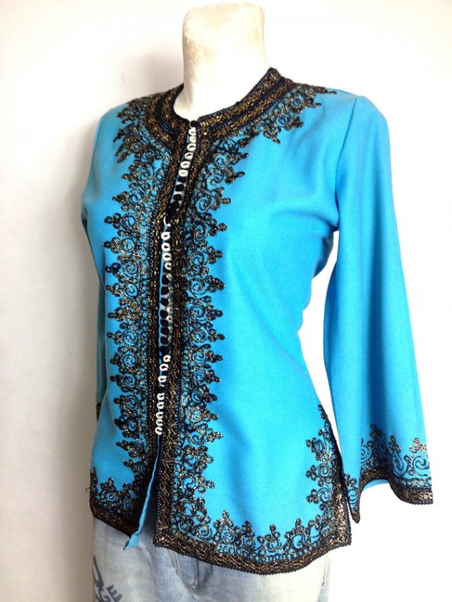 Turkusowy żakiet w orientalnym stylu o fasonie delikatnie rozkloszowanym, zapinany na pętelki, pięknie zdobiony czarną i złotą grubą nicią która tworzy wzór ornamentów. Rękawy rozkloszowane. U dołu krótkie rozcięcia
