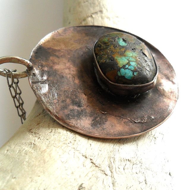 Zawieszka miedziana z naturalnym kamieniem turkusu.Średnica tarczy 6cm.Łańcuszek w komplecie.