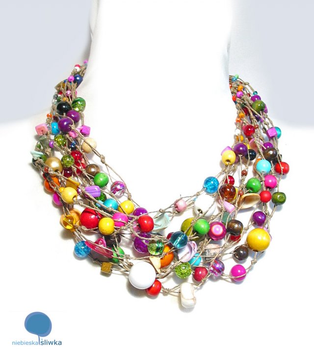 Lniany naszyjnik pełen pozytywnej energii. Wykonany na naturalnej przędzy z wielobarwnych w różnych kształtach korali szklanych, akrylowych, drewnianych, masy perłowej, muszelek i garści wielobarwnych minerałów. Długość naszyjnika mierzona po zapięciu ok. 50 cm, zapięcie posrebrzane. Biżuteria zawsze pakowana jest w eko- kartonik. Gotowa na prezent!