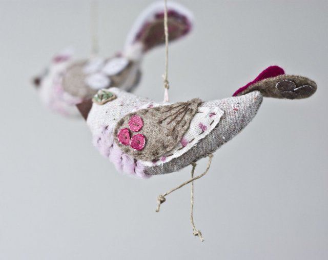 Dwa ptaszki wiszące pod gałązką lekko porusza się przy najmniejszym ruchu powietrza. Ptaszki zostały ręcznie uszyte z naturalnych tkanin w odcieniach beżowym, różowym, białym i zielonym. Zawieszka pasuje do pokoju małej dziewczynk, ale także sprawdzi się w innych pomieszczeniach domu. Rozmiary dekoracji: od ozdoby na sznureczku do nóżek ptaszka to około 50cm, szer: 25cm; wielkość pojedynczego ptaszka to około 15x7cm.
