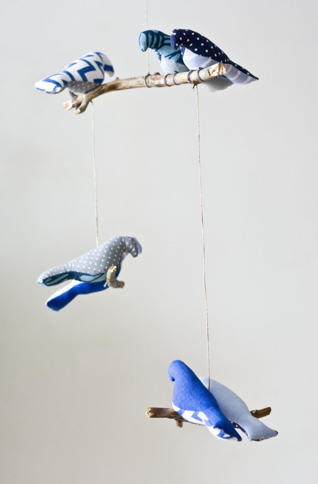 Siedem ptaszków siedzących na gałązkach lekko porusza się przy najmniejszym ruchu powietrza. Ptaszki zostały uszyte z tkanin w kolorze błękitnym, białym, granatowym i szarym. Zawieszka pasuje zarówno do pokoju małego chłopca, ale także sprawdzi się w innych pomieszczeniach domu. Rozmiary dekoracji: dł: 36cm, szer: 25cm; wysokość pojedynczego ptaszka to około 12cm.