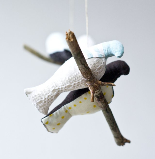 Siedem ptaszków siedzących na gałązkach lekko porusza się przy najmniejszym ruchu powietrza. Ptaszki zostały uszyte z tkanin w kolorze kremowym, seledynowym, brązowym, żółtym i białym. Zawieszka pasuje zarówno do pokoju małej dziewczynki jak i małego chłopca, ale także sprawdzi się w innych pomieszczeniach domu. Rozmiary dekoracji: dł: 40cm, szer: 25cm; wysokość pojedynczego ptaszka to około 12cm.
